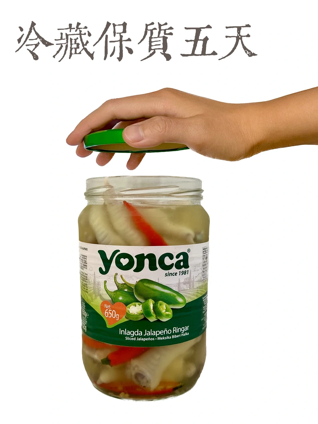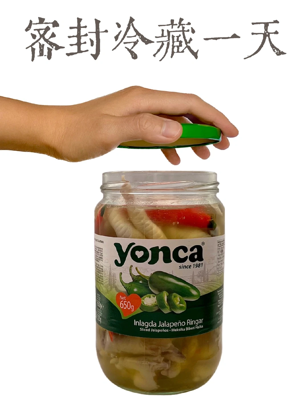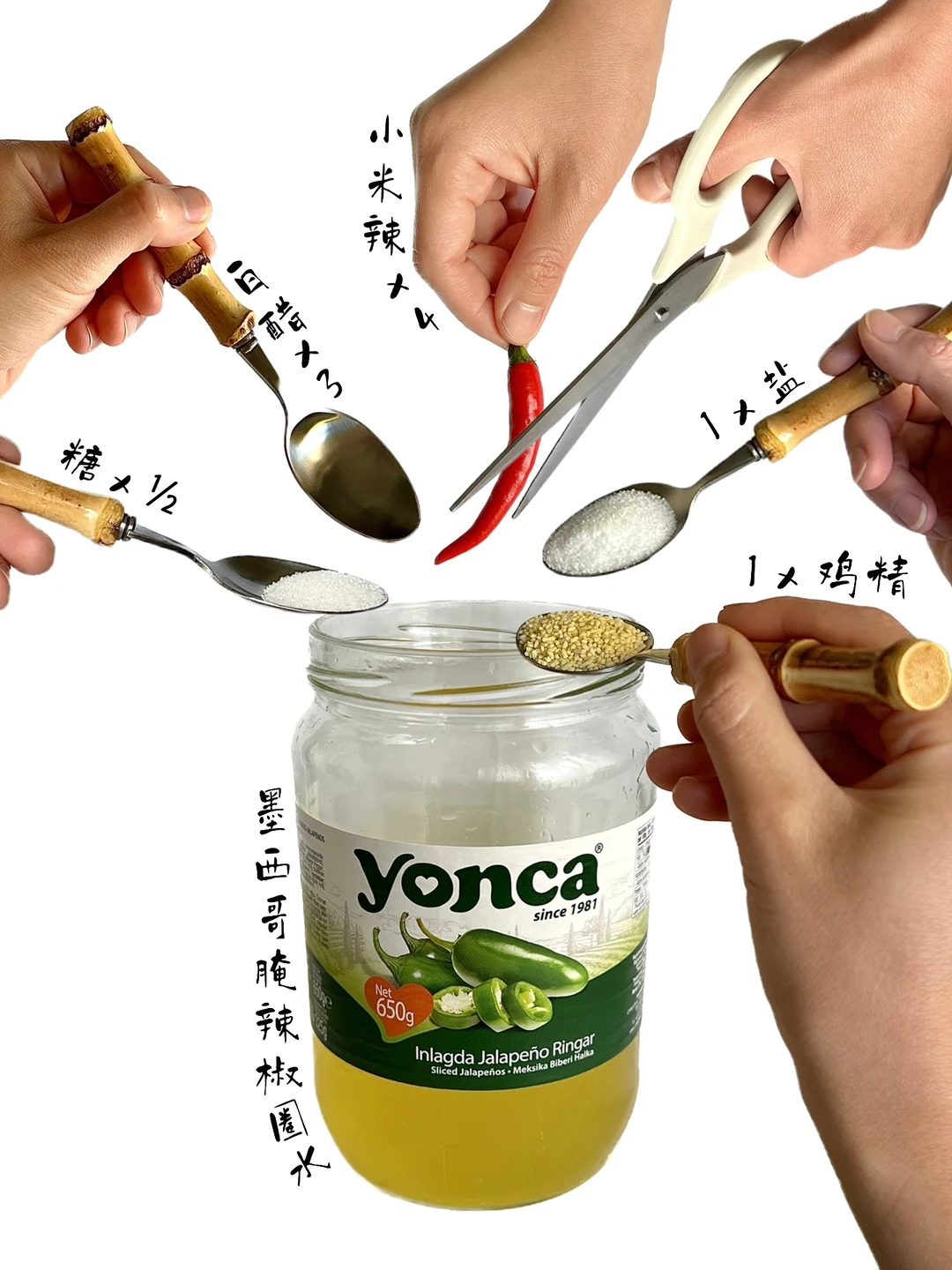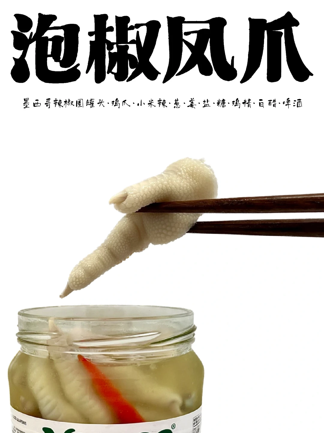 这款辣椒圈罐头的味道无限接近泡椒 吃完里面的辣椒圈 用剩下的水和瓶子做一罐泡椒凤爪 味道真的是太赞了!!! 👉Tips 调味🉑️根据个人喜好调整 喜欢酸的多加点醋 能吃辣的多加小米辣 胡萝卜和芹菜喜欢也加点 ⚠️口味 墨西哥腌辣椒圈的品牌不同 做出来的泡椒凤爪口味可能会有差异 🉑️尝试调整调料用量调整口味