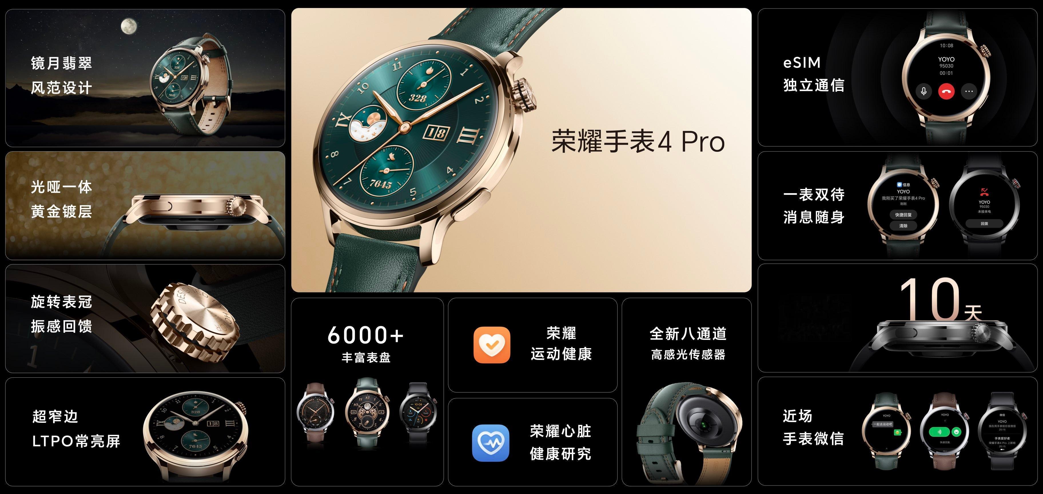 荣耀手表4 Pro 精钢锻造带黄金镀层,质感独特,1.5英寸LTPO屏幕,支持eSIM独立通信功能,在eSIM典型模式10天、普通模式最长14天续航。