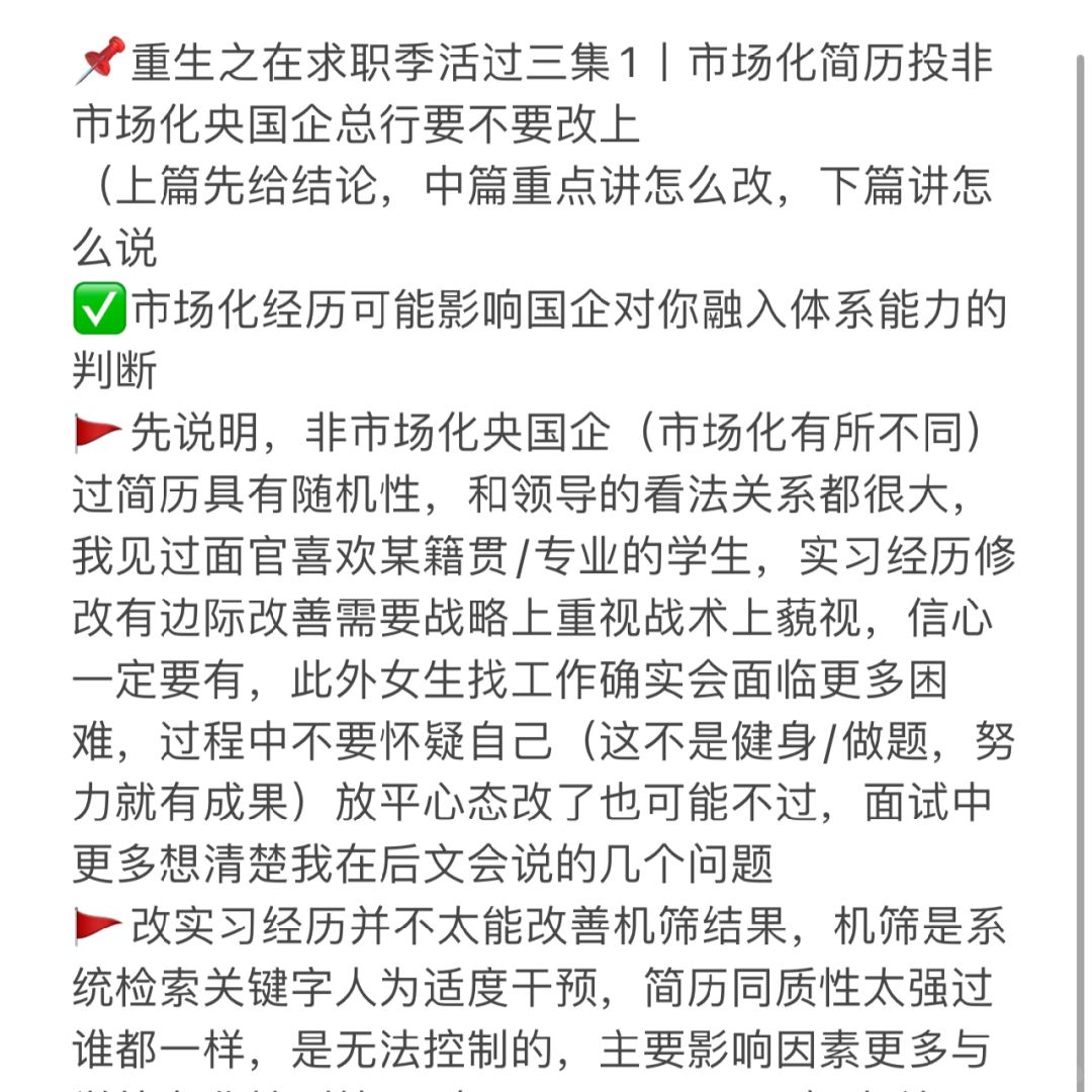 🚩先说明,非市场化央国企(市场化有所不同)过简历具有随机性,和领导的看法关系都很大,我见过面官喜欢某籍贯/专业的学生,实习经历修改有边际改善需要战略上重视战术上藐视,信心一定要有,此外女生找工作确实会面临更多困难,过程中不要怀疑自己(这不是健身/做题,努力就有成果)放平心态改了也可能不过,面试中更多想清楚我在后文会说的几个问题
