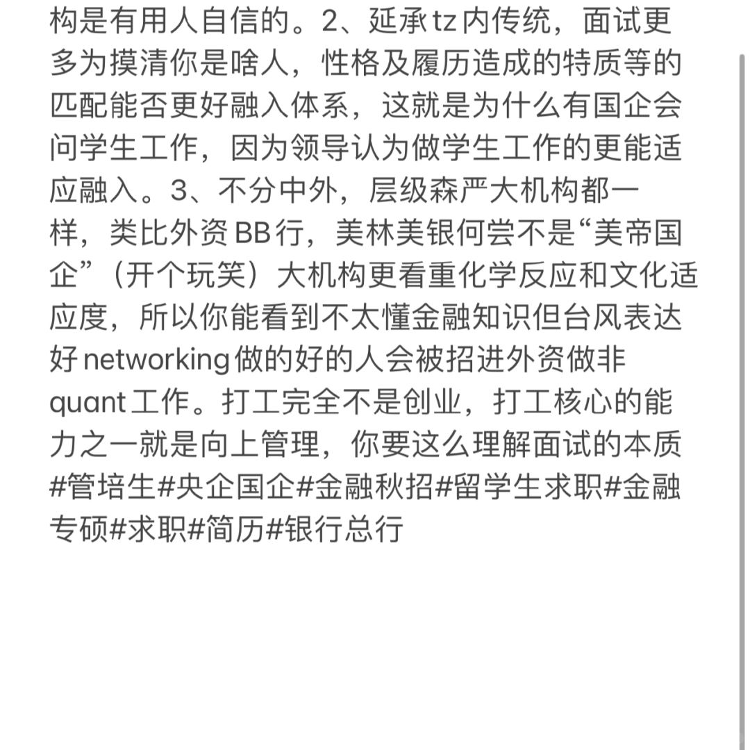 🚩明确过了基本门槛后国企选人前提是看重融入体系的能力,不要让市场化履历让面试官认定影响了你融入系统的能力觉得你呆不久:1、央国企总行这种大机构默认工作新人熟悉一下都能干(也确实简单,难的是协调搞人的能力)再加上不给超额薪酬激励,小兵不贵谁干都一样,大机构是有用人自信的。2、延承tz内传统,面试更多为摸清你是啥人,性格及履历造成的特质等的匹配能否更好融入体系,这就是为什么有国企会问学生工作,因为领导认为做学生工作的更能适应融入。3、不分中外,层级森严大机构都一样,类比外资BB行,美林美银何尝不是“美帝国企”(开个玩笑)大机构更看重化学反应和文化适应度,所以你能看到不太懂金融知识但台风表达好networking做的好的人会被招进外资做非quant工作。打工完全不是创业,打工核心的能力之一就是向上管理,你要这么理解面试的本质