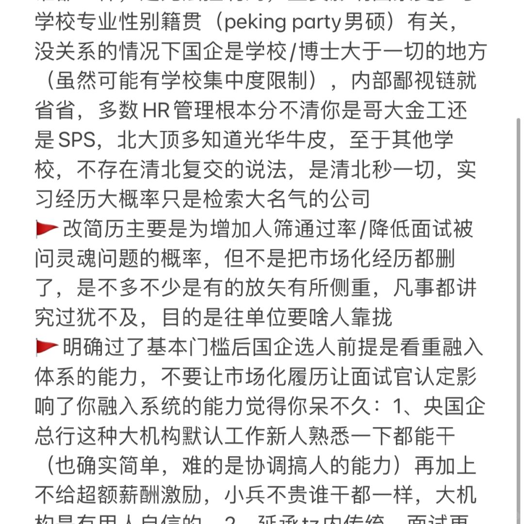 🚩改实习经历并不太能改善机筛结果,机筛是系统检索关键字人为适度干预,简历同质性太强过谁都一样,是无法控制的,主要影响因素更多与学校专业性别籍贯(peking party男硕)有关,没关系的情况下国企是学校/博士大于一切的地方(虽然可能有学校集中度限制),内部鄙视链就省省,多数HR管理根本分不清你是哥大金工还是SPS,北大顶多知道光华牛皮,至于其他学校,不存在清北复交的说法,是清北秒一切,实习经历大概率只是检索大名气的公司