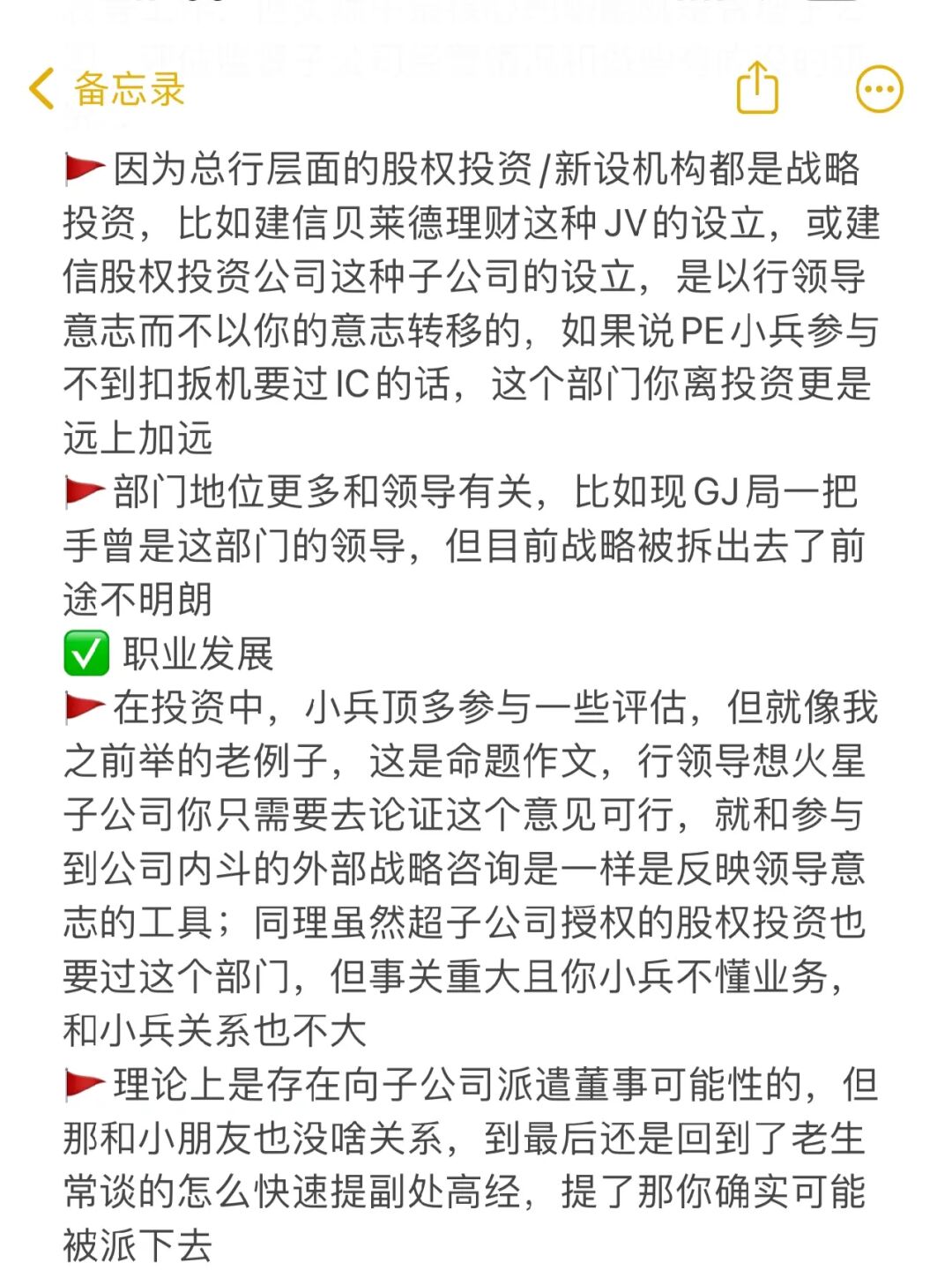 🚩因为总行层面的股权投资/新设机构都是战略投资,比如建信贝莱德理财这种JV的设立,或建信股权投资公司这种子公司的设立,是以行领导意志而不以你的意志转移的,如果说PE小兵参与不到扣扳机要过IC的话,这个部门你离投资更是远上加远