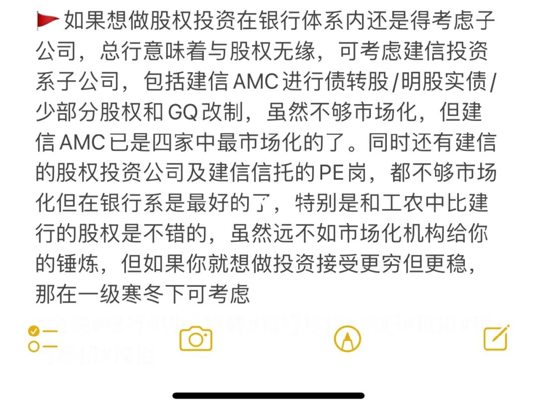 🚩如果想做股权投资在银行体系内还是得考虑子公司,总行意味着与股权无缘,可考虑建信投资系子公司,包括建信AMC进行债转股/明股实债/少部分股权和GQ改制,虽然不够市场化,但建信AMC已是四家中最市场化的了。同时还有建信的股权投资公司及建信信托的PE岗,都不够市场化但在银行系是最好的了,特别是和工农中比建行的股权是不错的,虽然远不如市场化机构给你的锤炼,但如果你就想做投资接受更穷但更稳,那在一级寒冬下可考虑