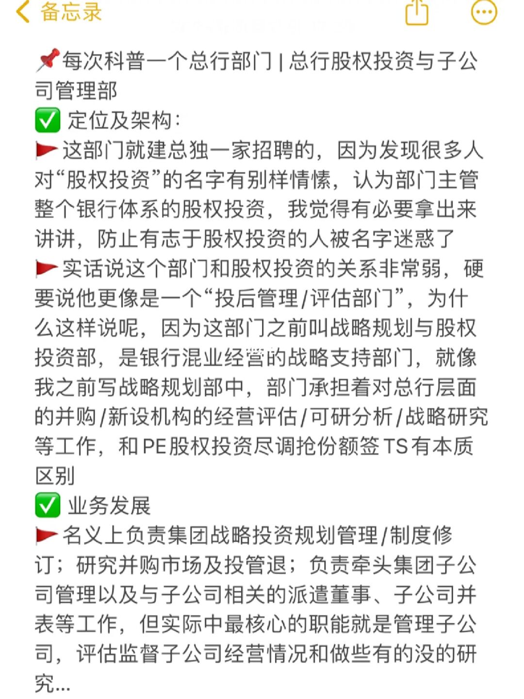 🚩实话说这个部门和股权投资的关系非常弱,硬要说他更像是一个“投后管理/评估部门”,为什么这样说呢,因为这部门之前叫战略规划与股权投资部,是银行混业经营的战略支持部门,就像我之前写战略规划部中,部门承担着对总行层面的并购/新设机构的经营评估/可研分析/战略研究等工作,和PE股权投资尽调抢份额签TS有本质区别