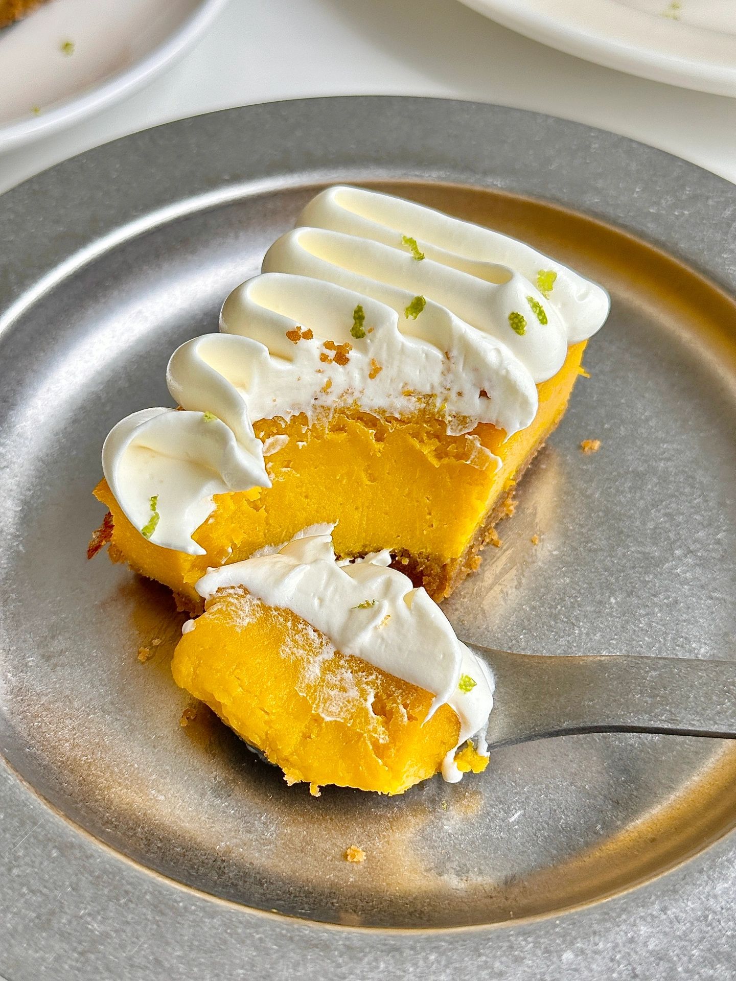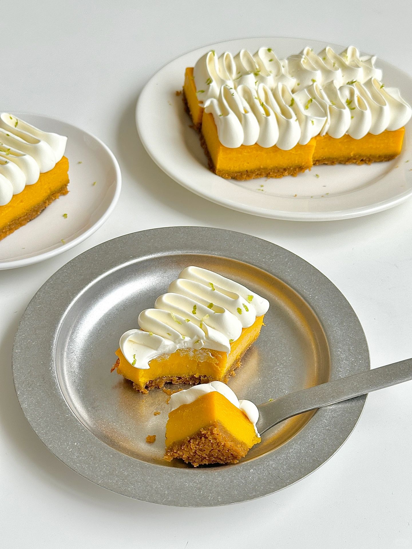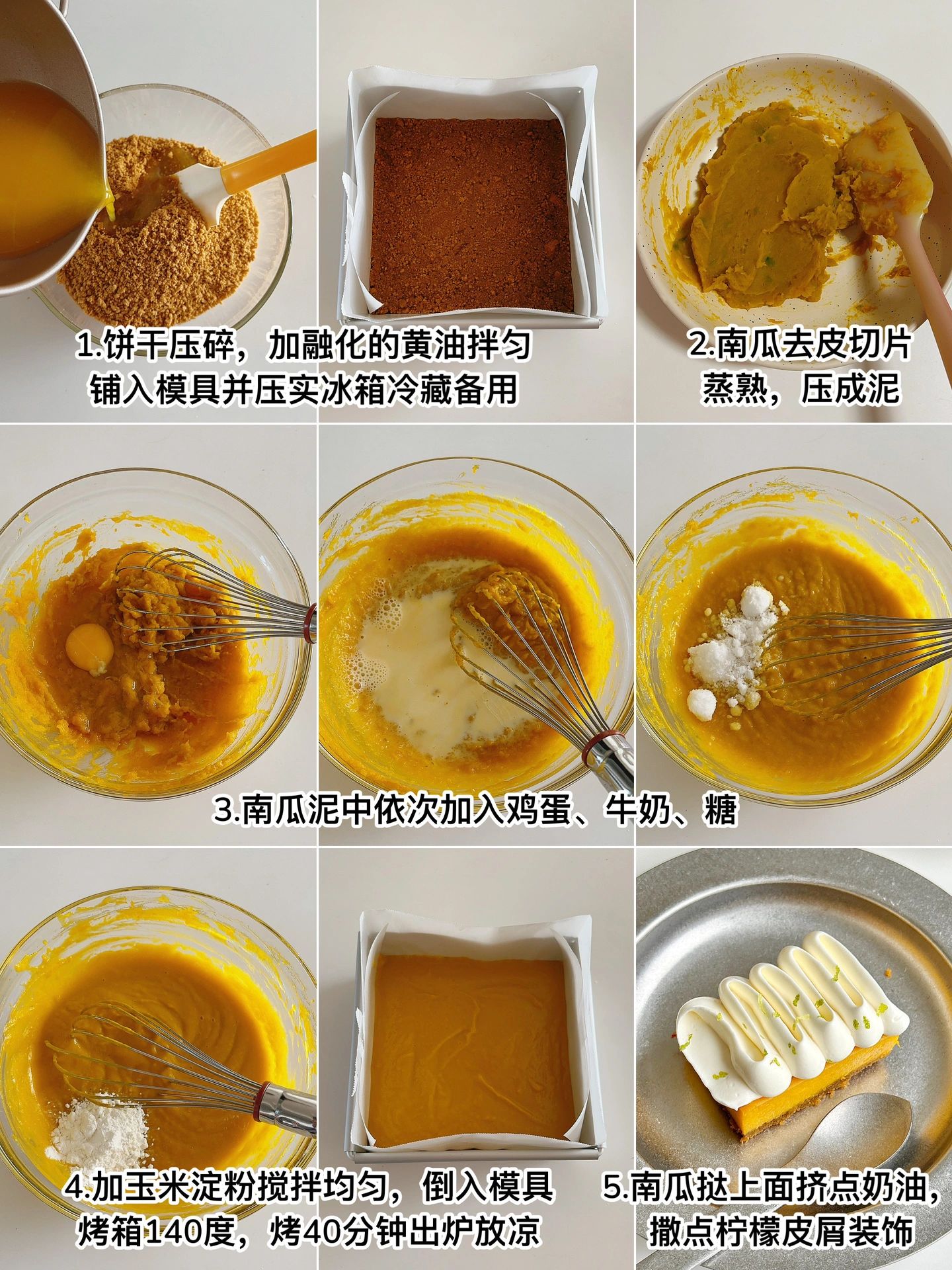 香甜细腻软糯的南瓜挞 秋日☀️的下午茶 安排它再合适不过了 ✔️食材 消化饼干90g 融化的黄油50g 去皮南瓜300g 全蛋1个 牛奶65g 糖25g 玉米淀粉10g ✔️做法 -饼干压碎➕融化的黄油拌匀,铺入模具并压实冰箱冷藏备用 -南瓜蒸熟压成泥,依次加入全蛋、牛奶、糖、玉米淀粉搅拌均匀倒入模具,烤箱140°,烤40分钟出炉放凉 -打发一点奶油挤在南瓜挞上面,再撒点柠檬皮屑就完成了