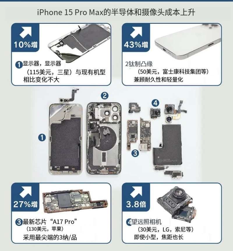 三星屏幕115美元,比去年贵了10%;钛金属机身成本50 美元,比之前的不锈钢材料贵了43%;A17 Pro 芯片成本130 美元,相比 A16 上涨了 27%。长焦镜头的成本最高,相当于去年涨了3.8 倍,要30 美元。