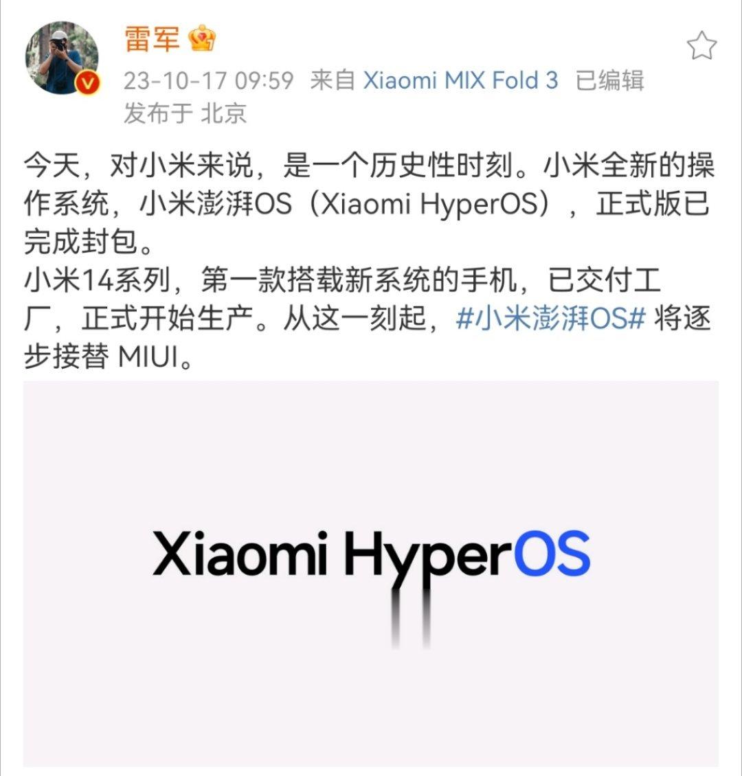 今天小米创办人,董事长兼CEO雷军正式官宣小米全新的操作系统——小米澎湃OS(Xiaomi HyperOS)