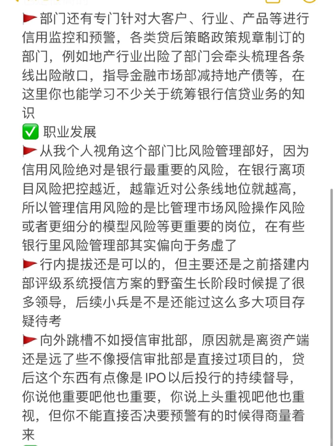 🚩向外跳槽不如授信审批部,原因就是离资产端还是远了些不像授信审批部是直接过项目的,贷后这个东西有点像是IPO以后投行的持续督导,你说他重要吧他也重要,你说上头重视吧他也重视,但你不能直接否决要预警有的时候得商量着来