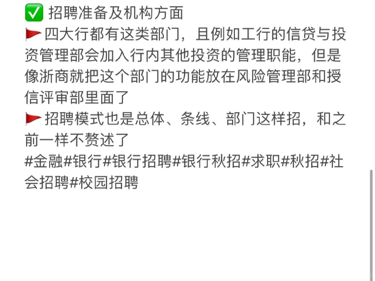 🚩四大行都有这类部门,且例如工行的信贷与投资管理部会加入行内其他投资的管理职能,但是像浙商就把这个部门的功能放在风险管理部和授信评审部里面了