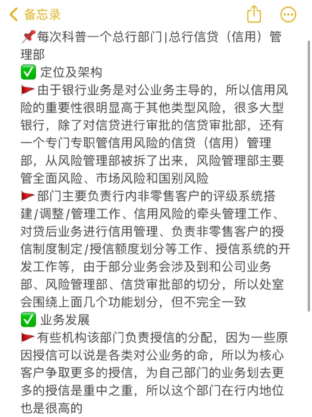 🚩由于银行业务是对公业务主导的,所以信用风险的重要性很明显高于其他类型风险,很多大型银行,除了对信贷进行审批的信贷审批部,还有一个专门专职管信用风险的信贷(信用)管理部,从风险管理部被拆了出来,风险管理部主要管全面风险、市场风险和国别风险