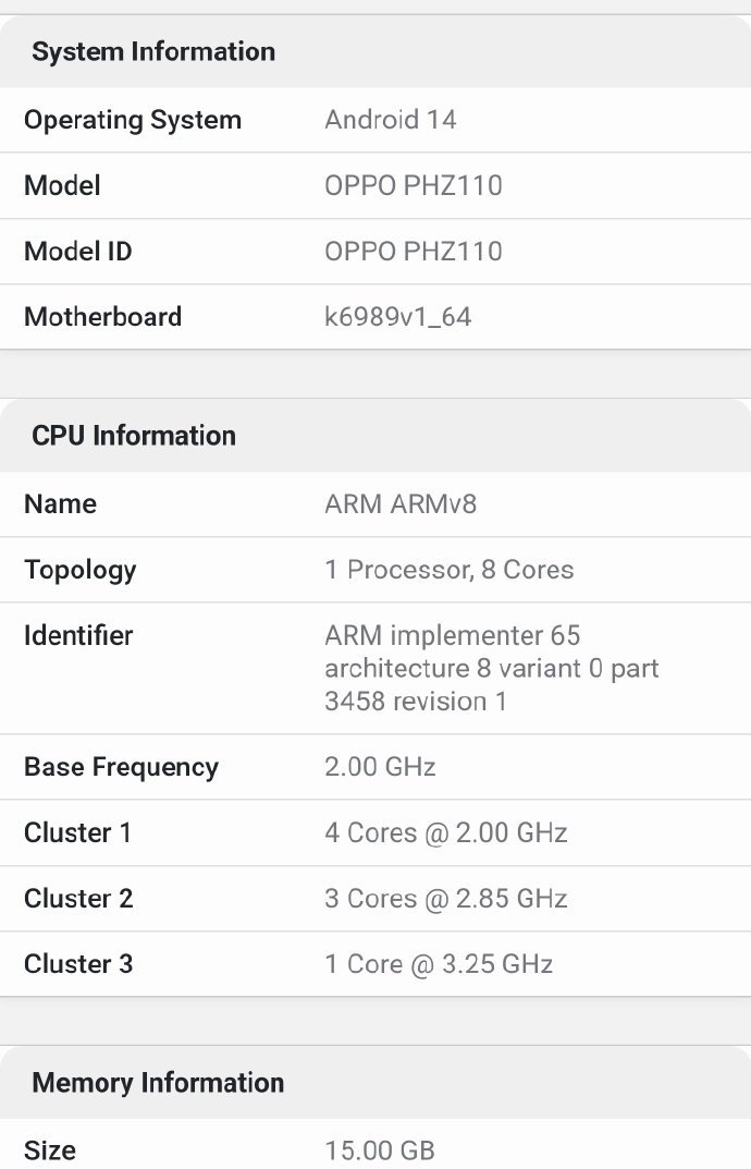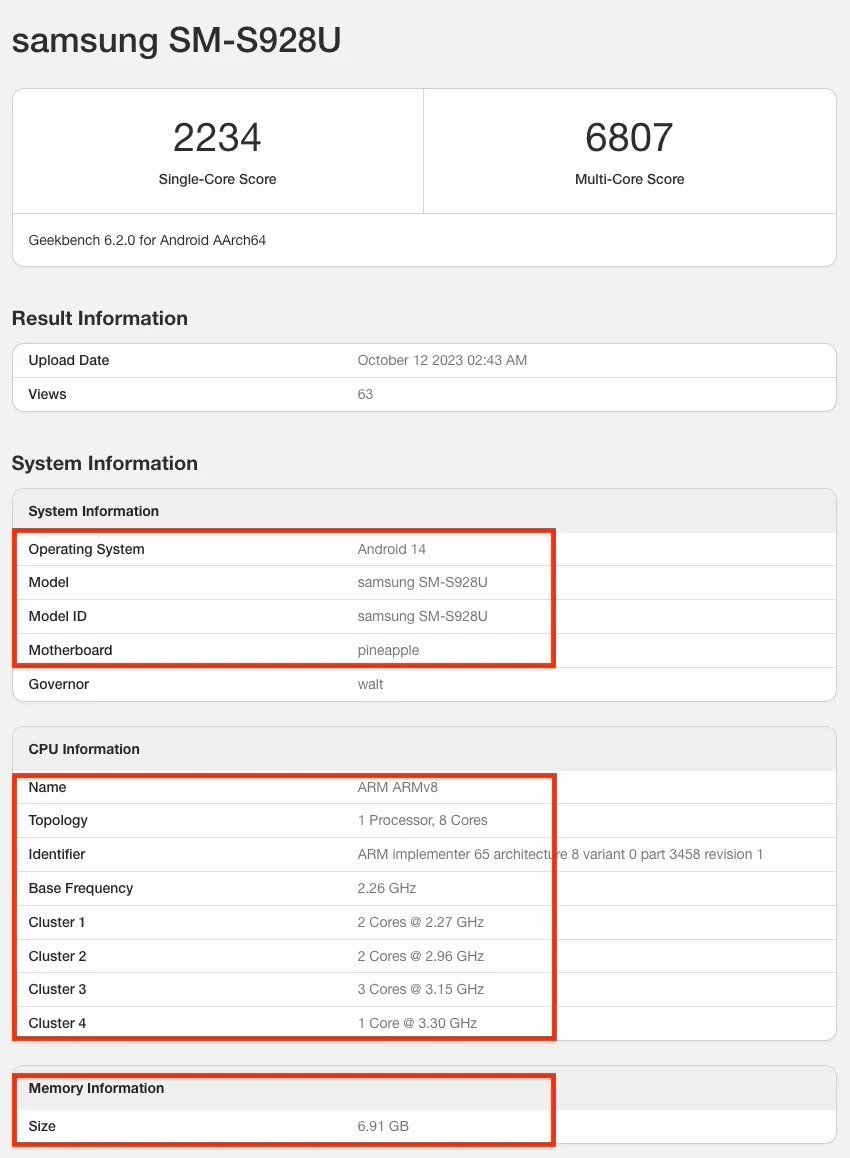 骁龙 8 Gen 3 最高频率 3.3GHz。1+3+2+2设计(单核 2234、多核 6807)