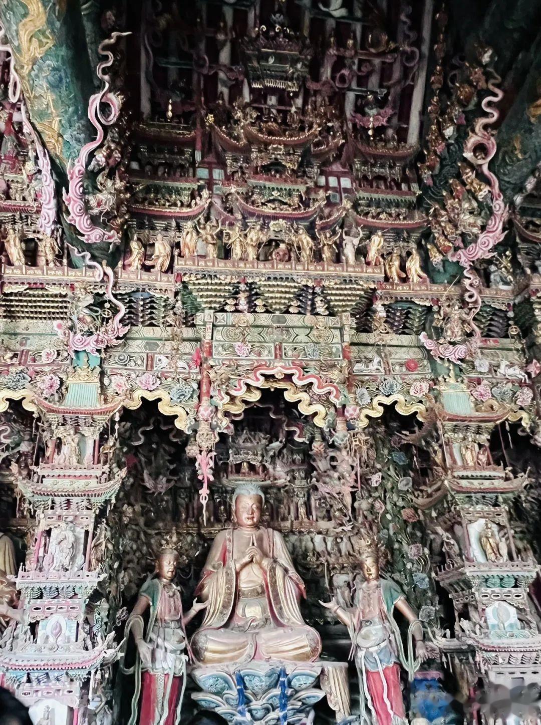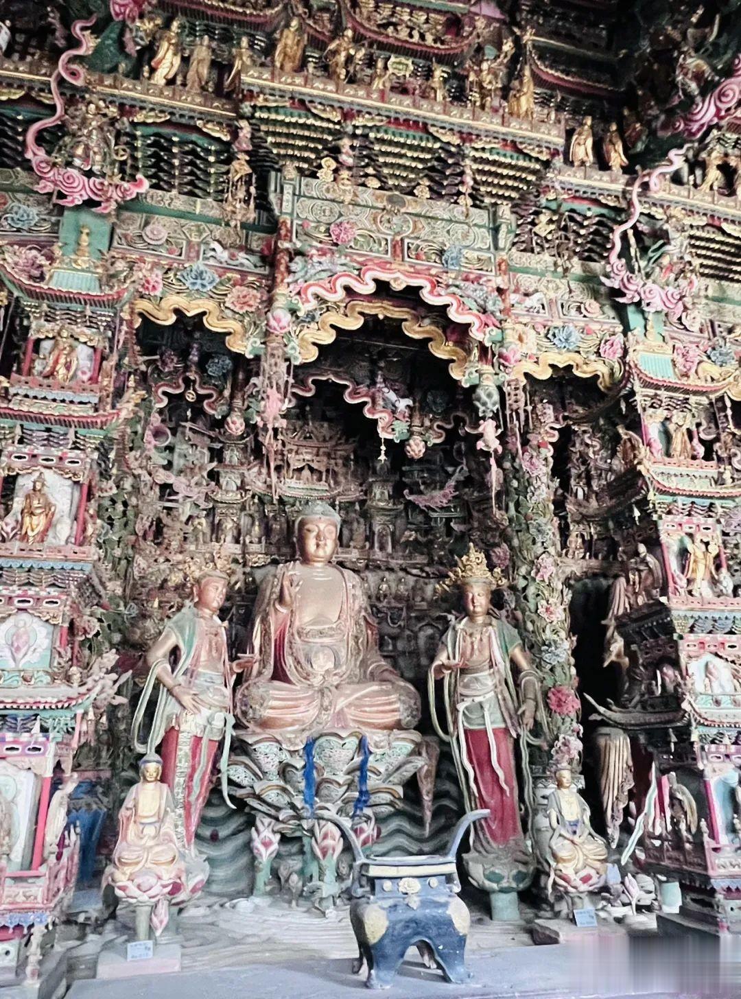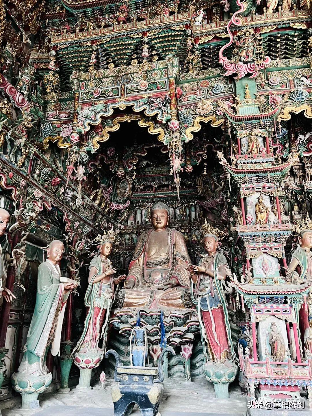 山西隰县,神佛满天小西天 小西天是一座佛教禅宗寺院,由明代东明禅师创建于明崇祯二年。大雄宝殿内的彩绘悬塑是小西天的精华,包括五个相互通联的佛龛和一系列佛教人物放事。这些雕塑人物体态造型各有变化,衣饰线条流畅而有韵律,色泽鲜艳,身体比例适度,肌肉丰满柔润,动作谐调大方,面部表情富于变化,栩栩如生,真可谓神形兼备。整体设计布局严谨,殿内近2000尊塑像绝大部分采用了贴金,且人物均有约15°的前倾,使殿堂几乎无尘,是人类泥塑的巅峰,是无法超越无可比拟的高超技艺。