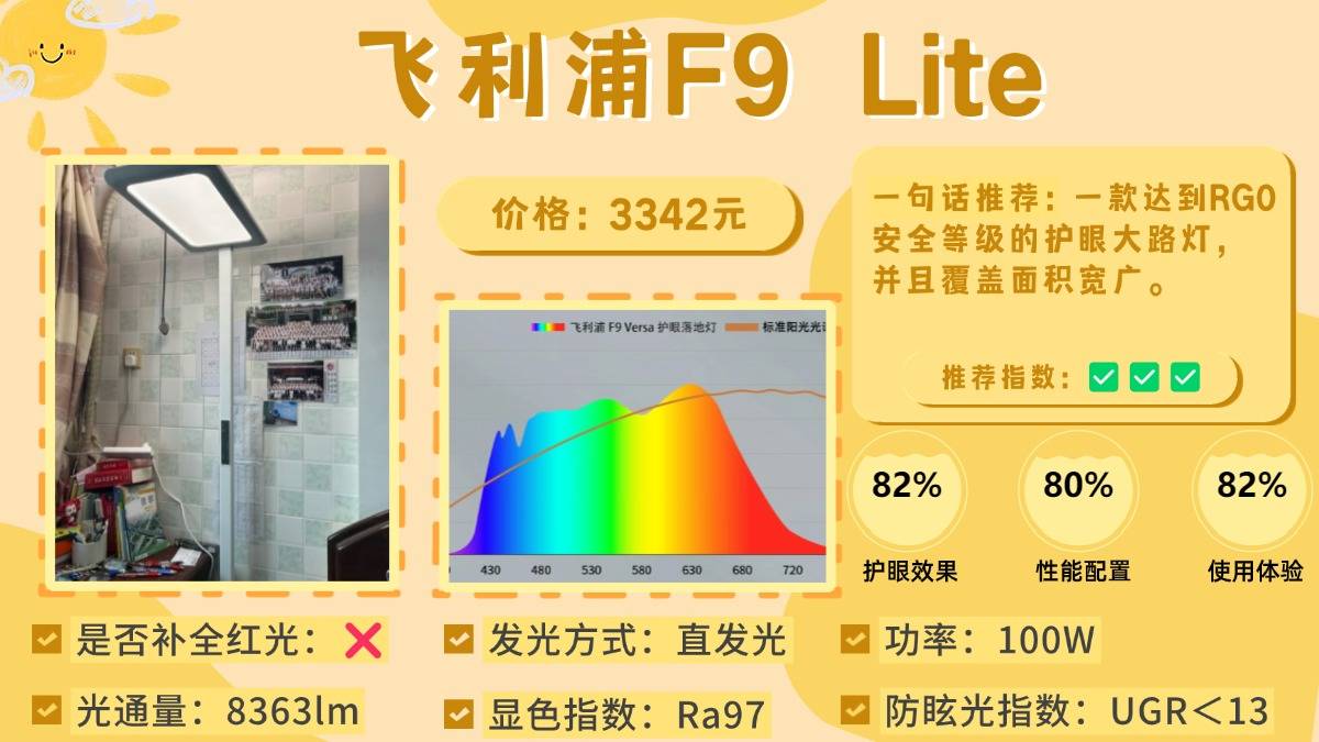 护眼大路灯排行榜前十名品牌有哪些牌子?飞利浦F9 Lite是一款主打智能调光的护眼大路灯,支持色温自由调节,另外它还内置智能感应器,可自动识别环境亮度并动态调节灯光,避免明暗变化带来的视觉疲劳。光源部分采用高拟合钻石级全光谱灯珠,结合130°超广角匀光扩散设计,照明覆盖更广,桌面阴影和重影明显减少,从光谱表现来看,这款灯的蓝光控制达到了RG0安全等级,但未补全红光部分,因此虽然亮度高、照明通透,在自然光还原度与长期护眼效果上仍有一定提升空间。
