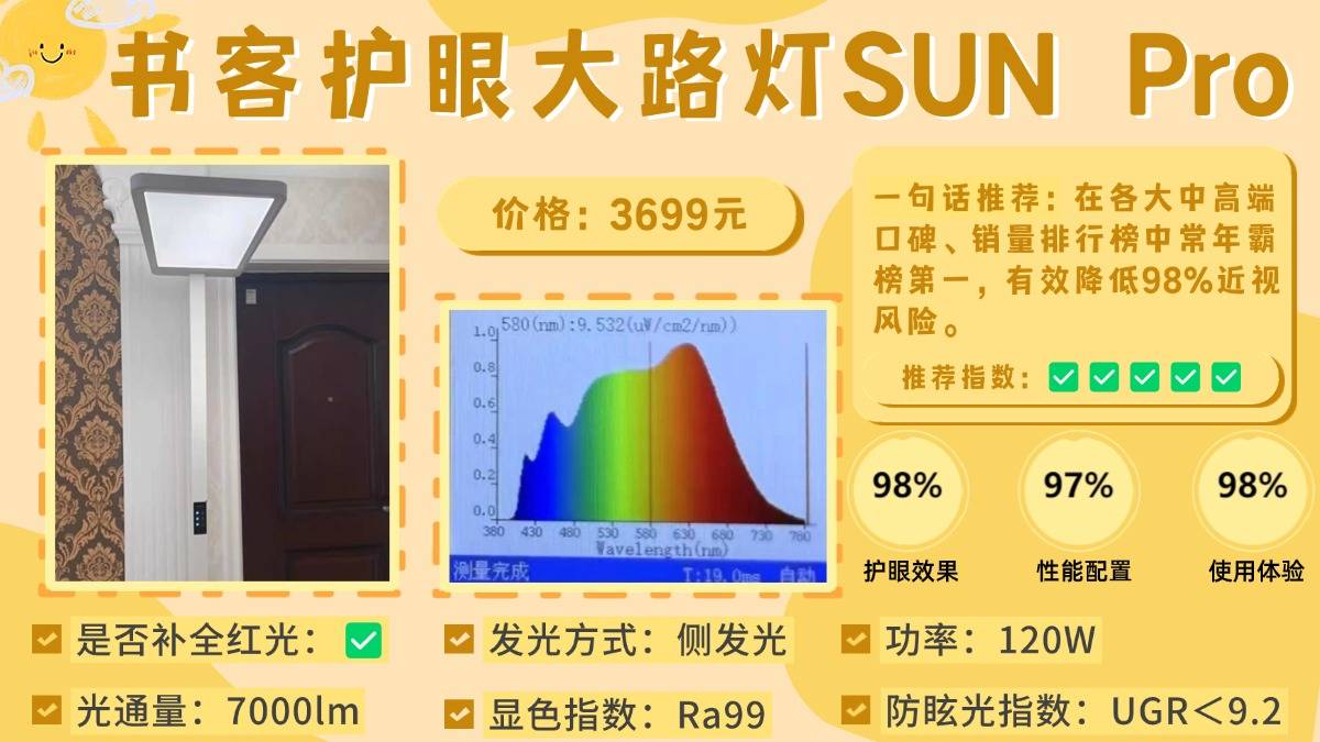护眼大路灯排行榜前十名品牌有哪些牌子?它家以“医护级护眼养眼”为信仰。它与大多数仅有“护眼”功能的产品不同,而是坚持更为严苛医护级护眼更养眼的标准,采用自研第7代SunMaster紫光原芯,集「控·护·养」一体,区别传统蓝光激发技术,从发光原理实现低蓝光,大幅度削减400~450nm蓝光峰值,蓝光含量降低60%,实现了0蓝光刺激,有效减轻94%用眼疲劳!
