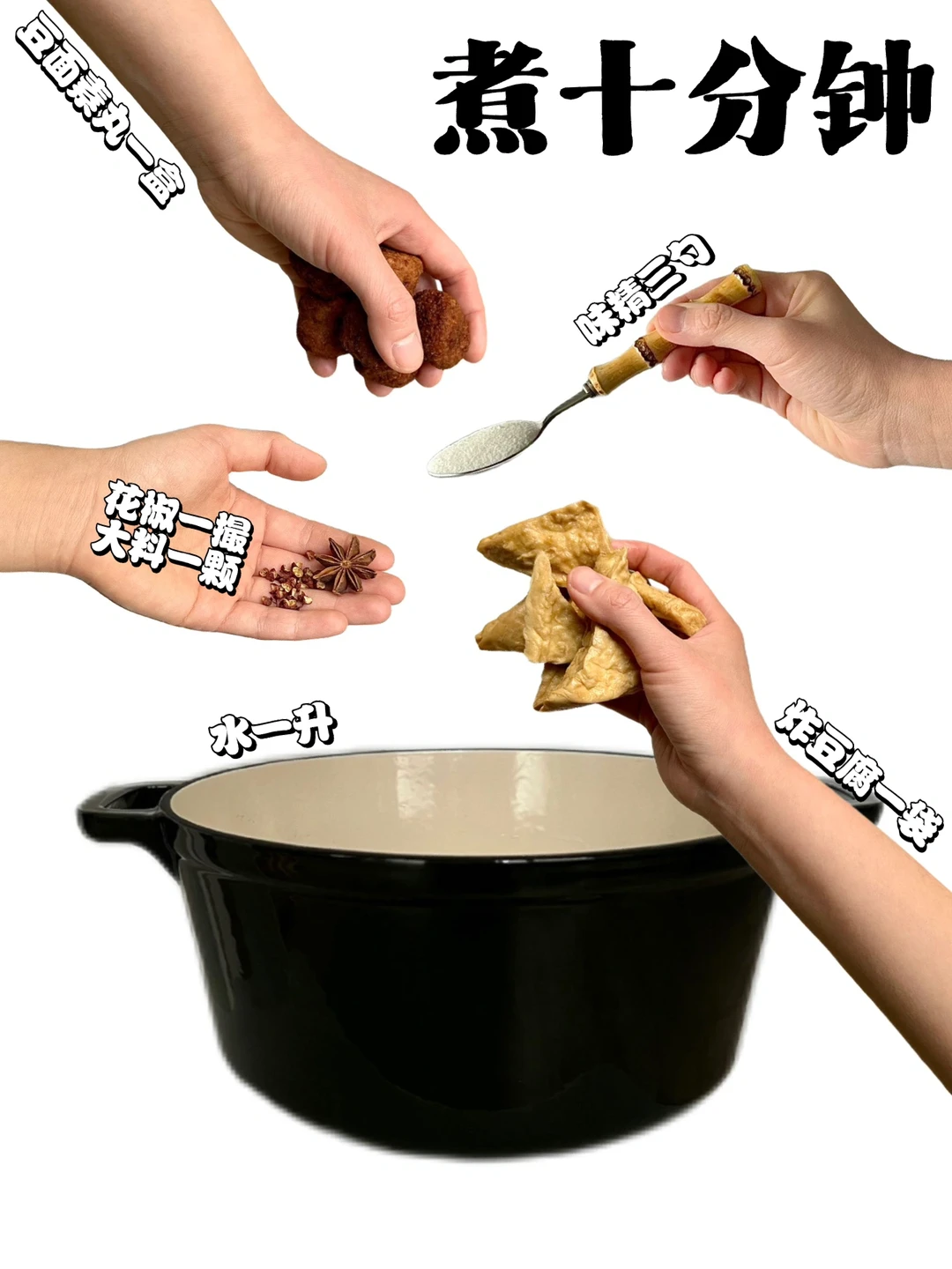 1⃣️炸豆腐、植物素肉丸、花椒和大料加水煮十分钟或以上