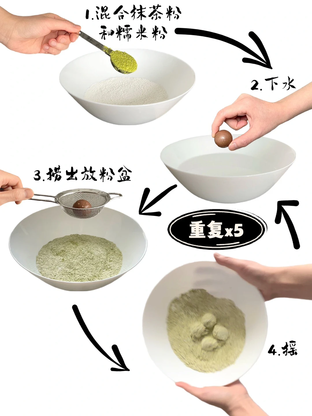 是会流心的巧克力馅抹茶元宵呀~ 👉步骤 1. 混合糯米粉和抹茶粉 2. 巧克力放入盛有冷水的盆 3. 捞出巧克力放入混合粉的盆 4. 摇晃盆让巧克力滚动并沾满粉后捞出 5. 步骤2-4重复五遍(或以上) 6. 水沸下锅煮至完全浮起 7. 盛出元宵撒花瓣装饰(可略) 👉Tips 喜欢厚皮元宵🉑️多重复几次步骤2-4 抹茶粉的量🉑️按口味添加 👉元宵保存 冰箱冷冻 随吃随煮 👉工具 漏勺网眼粗且勺尺寸大的更易操作 我这漏勺太小了 得一个一个捞 网眼也太细了 粉不易筛出