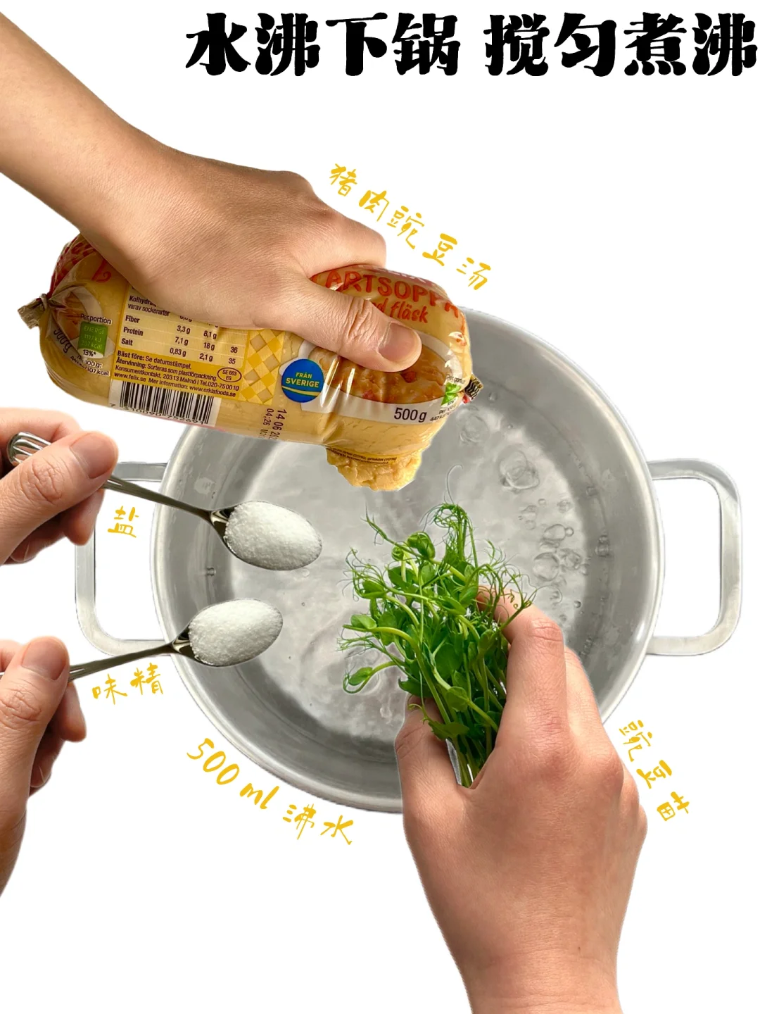 重庆主打豌豆汤,四川是豆汤饭。 味道就是一个字“鲜”! 👉简介 这款速食汤是已经调好味的 加水煮后味道会被稀释 所以需要调味料加持一下味道 👉Tips 调料用量🉑️按口味添加 味精🉑️用鸡精替换 豌豆苗和葱花🉑️按喜好选择性添加 🉑️按喜好额外添加火腿肠等配菜 👉极简做法 食材和调料都放碗里加开水搅匀 盖保鲜膜并在上面戳几个洞 放微波炉高火加热就好了
