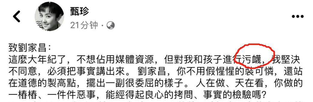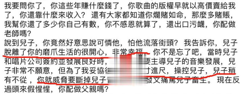 家丑外扬?80岁音乐教父曝光前妻和儿子丑行,反被放图嘲讽 著名音乐大师刘家昌和前妻甑珍互相指责对方是“恶魔”和“纠缠不休”,声称前妻“侵占他人财产、私吞公款、套汇”等多项罪名,并曝光了前妻在离婚后,让儿子改名的事情。而前妻则反驳称自己投资的公司被蚕食,曾经为他解决债务问题,并表示儿子离开他过得很幸福。夫妻双方互撕,让人联想到娱乐圈中的各种爆料和纷争,大部分都是为了利益。