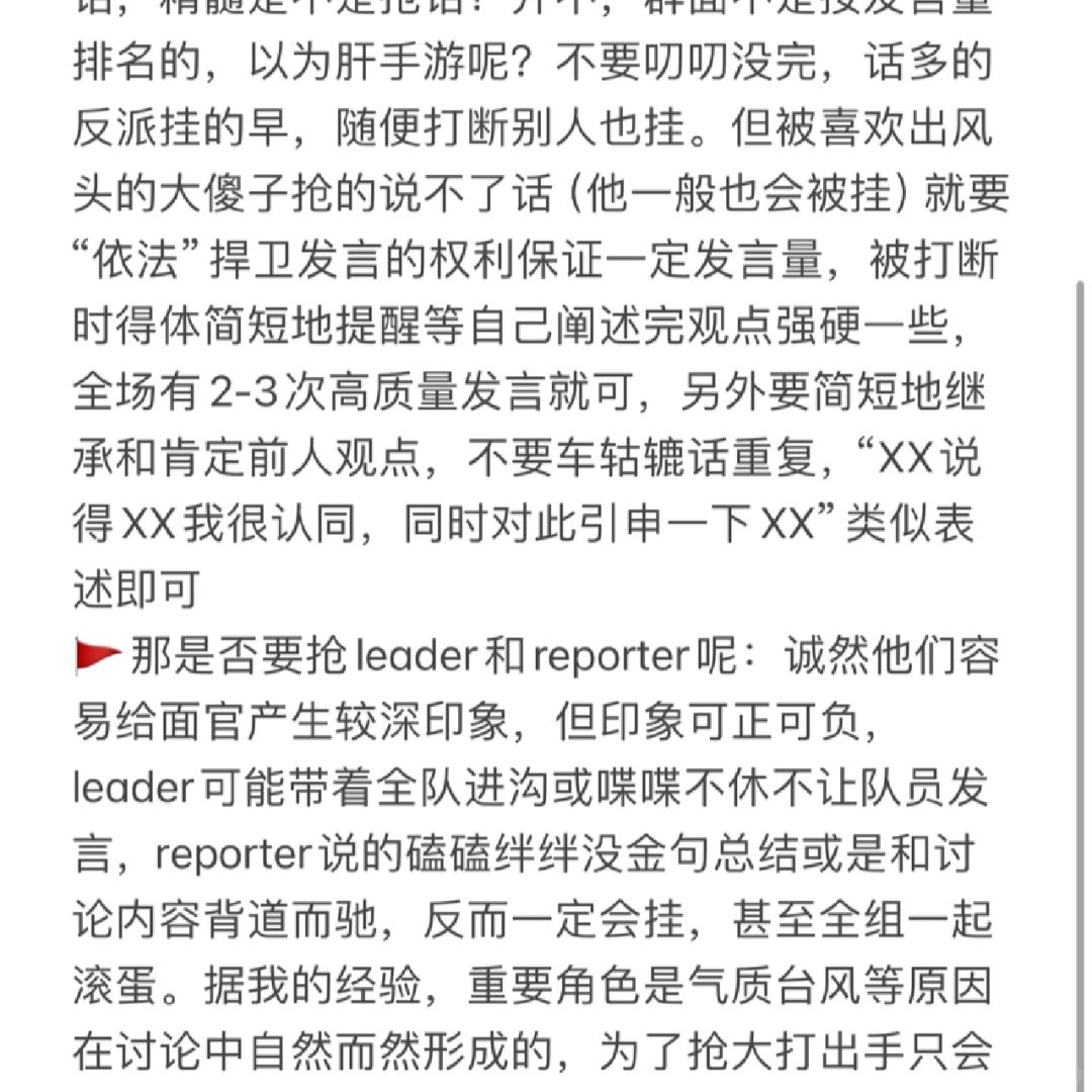 🚩那是否要抢leader和reporter呢:诚然他们容易给面官产生较深印象,但印象可正可负,leader可能带着全队进沟或喋喋不休不让队员发言,reporter说的磕磕绊绊没金句总结或是和讨论内容背道而驰,反而一定会挂,甚至全组一起滚蛋。据我的经验,重要角色是气质台风等原因在讨论中自然而然形成的,为了抢大打出手只会全组滚蛋,但也建议积极争取特别是大家比较蔫的情况,真有倔的退一步海阔天空做好高质量发言也可通过,不建议兼任leader和reporter