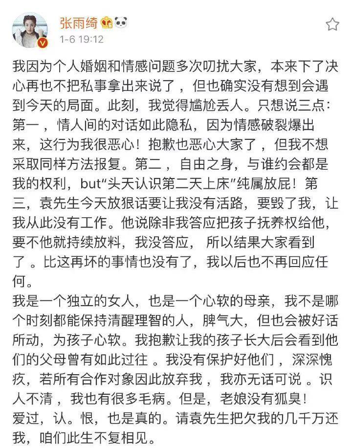 前夫被强制执行1.4亿,张雨绮:睡错男人不要紧,看错男人才可怕 张雨绮是一个家庭不完整的孩子,她的童年经历让她极度缺乏安全感。在她的演艺生涯中,她展现出了彪悍的大女主人设,但同时她也希望得到一个幸福安稳的家庭。然而,她的感情却一直不顺,她曾经和汪小菲、王全安、袁巴元等人有过感情纠葛。在与袁巴元离婚后,她的生活更加混乱,最终她以自己的方式离开了袁巴元,重新开始了自己的生活。