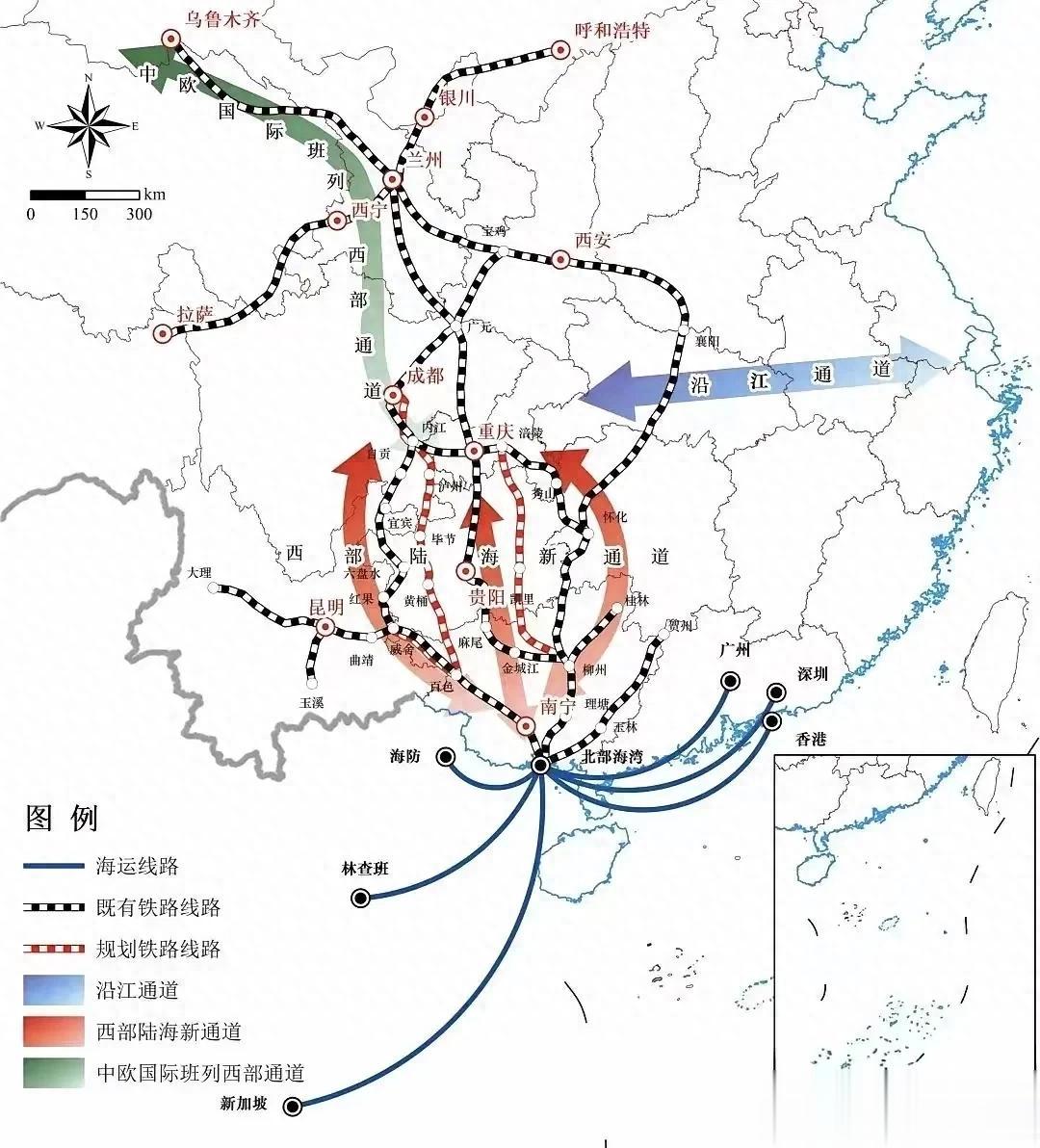 【“西部陆海新通道”内陆运河航线】:①完成广西区域的航道整治,开辟广西对接西南内陆的运河工程;②打通重庆至贵州到达广西的“渝黔桂运河”,这是实现“西部陆海新通道”水路延伸的重要工程,该工程是推进乌江、长江、珠江的重要环节;③构建四川东部河流串联,打造“川东大运河”,实现运河南下对接“渝黔桂运河”;④云南要开辟长江中上游运河港口,对接港口南下;⑤此外“湘桂运河”是“渝黔桂运河”的辅助线路。