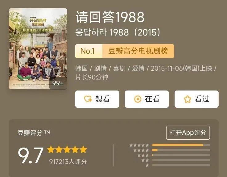 90万人打分,豆瓣剧榜第一,《请回答1988》的魔力,不止是能磕CP 《请回答1988》是一部值得多次观看的经典韩剧,其细节和剧情都非常优秀。通过剧中人物的故事,可以看出亲情、友情、爱情的温暖,以及暗含的人生道理。