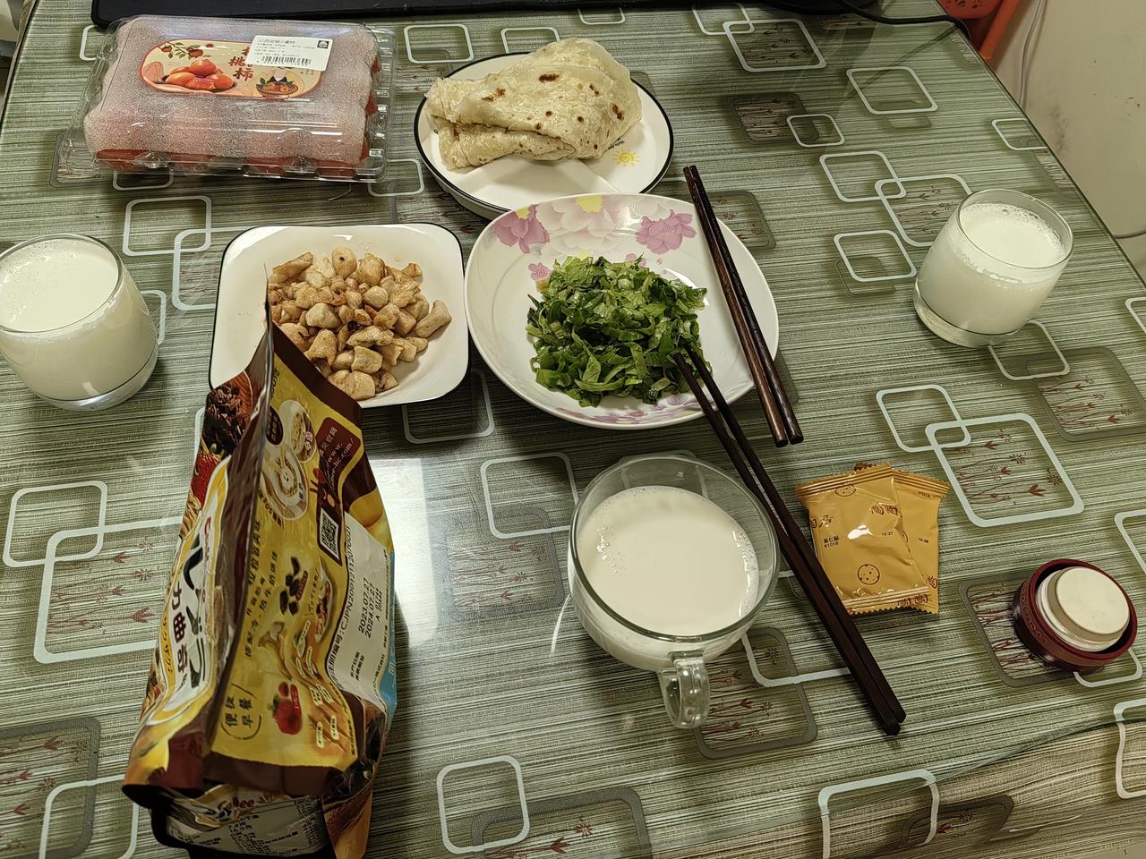 #记录今日三餐#早餐比较简单,煎了一个鸡肉粒,凉拌一个生菜。其他都是现成的,贵在营养成分差不多都有了。[大笑][大笑][大笑]