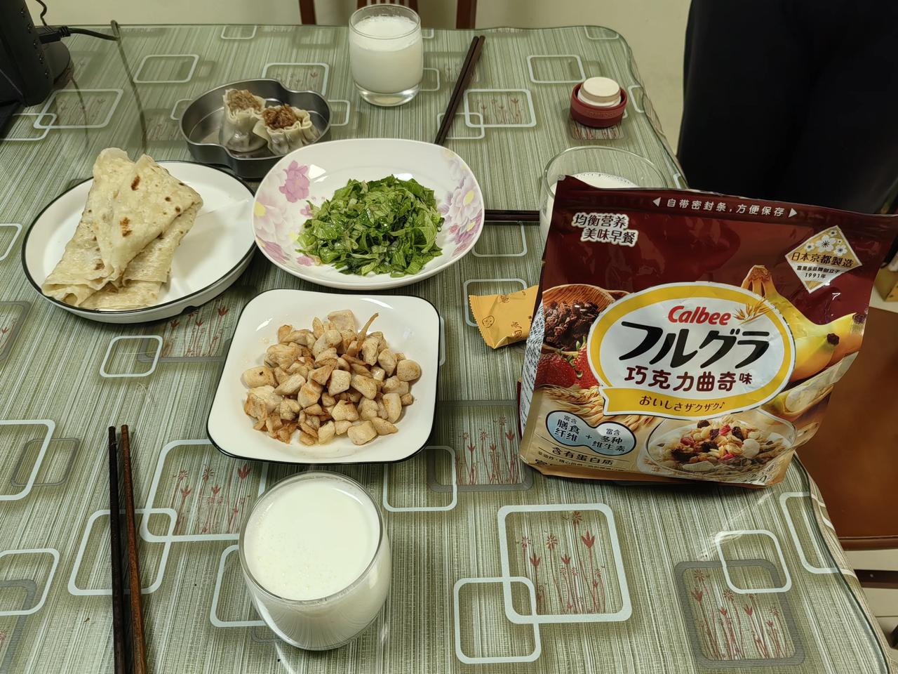 #记录今日三餐#早餐比较简单,煎了一个鸡肉粒,凉拌一个生菜。其他都是现成的,贵在