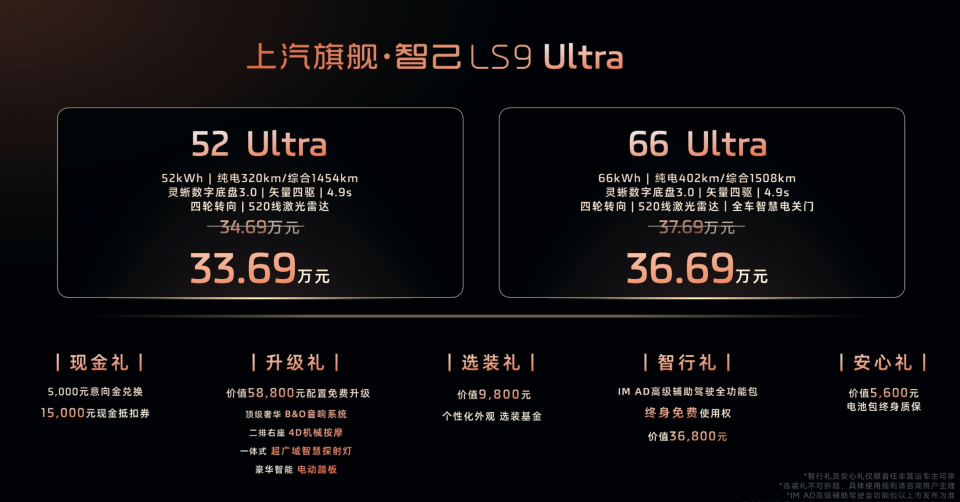 11月4日,上汽集团旗下高端智能纯电品牌智己汽车,以一场硬核技术发布会宣告旗舰车型——智己LS9正式开启全球预售。新车以“全系Ultra”的顶格配置,推出52 Ultra与66 Ultra两个超级增程版本,预售权益价分别为33.69万元与36.69万元。作为凝聚上汽70年造车底蕴与技术攻坚的集大成之作,LS9以“两大跨代际硬核科技+两大智能时代最强创新”,直面传统大六座SUV的痛点,重塑细分市场价值标杆。