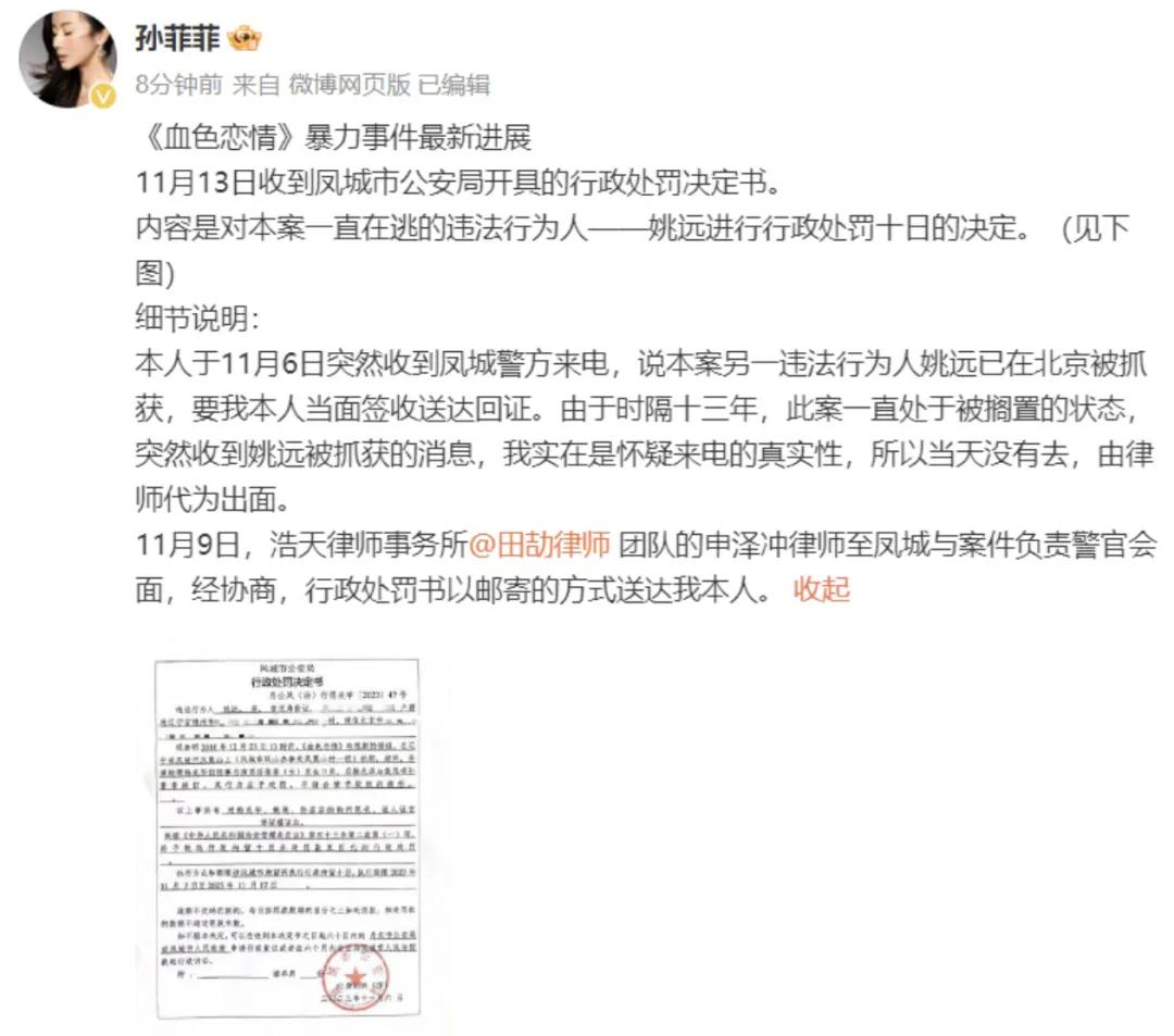 孙菲菲《血色恋情》暴力事件,最新进展来了!结局大快人心 演员孙菲菲在剧组被一群人殴打,毁容、骨折,还被网络攻击,被指责是“恶女人”、“耍大牌”,不得不狼狈退圈。她一直申诉、辩解,却引来更多嘲笑。如今,经过13年的漫长等待,她终于等来了结果。许多人的人生轨迹因此改变,包括她自己。孙菲菲的遭遇提醒我们,娱乐圈霸凌现象并不少见,受害者往往无法自证清白。