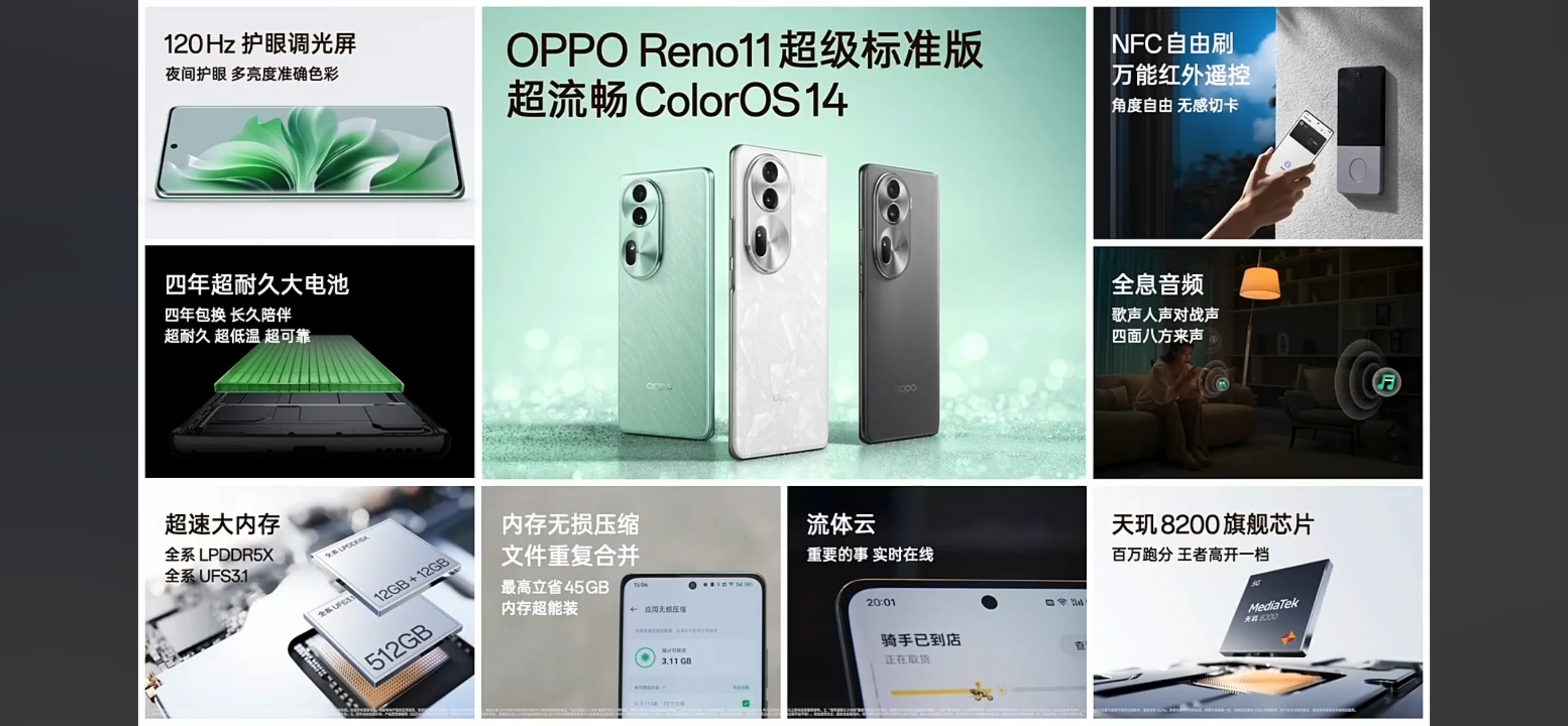 标准搭载天玑8200,Reno11 Pro搭载骁龙8+,均主打单反级人像摄影,影像三摄的规格为:3200万专业人像镜头+5000万像素F1.8大光圈主摄+800万像素超广角;有三款配色,外观设计主打轻奢和年轻群体;搭载ColorOS 14系统,带来了“流体云”等全新交互方式。
