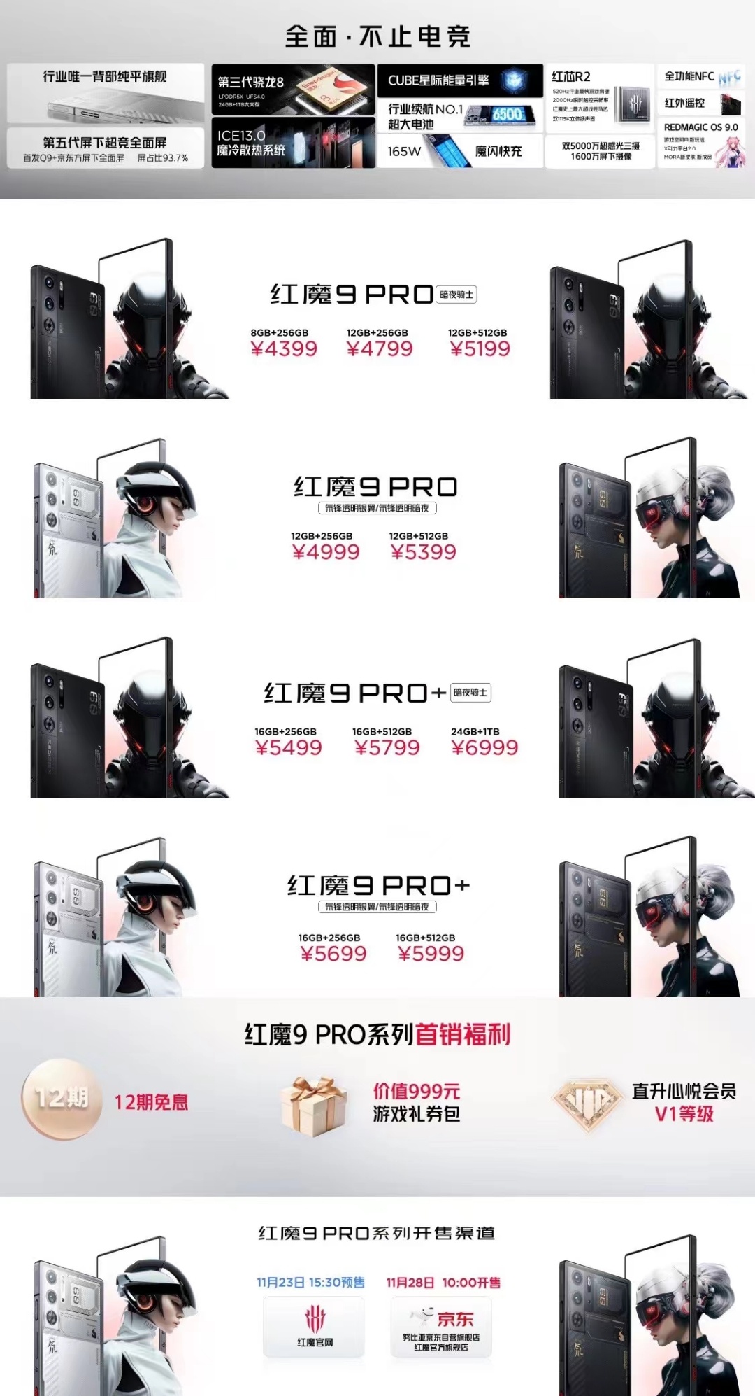 红魔9 Pro正式发布:第三代骁龙8的游戏手机,4399元起,外观机甲酷炫,背面摄像头纯平,屏下摄像头设计,首发京东方 Q9+ 发光材料,6500mAh大电池……