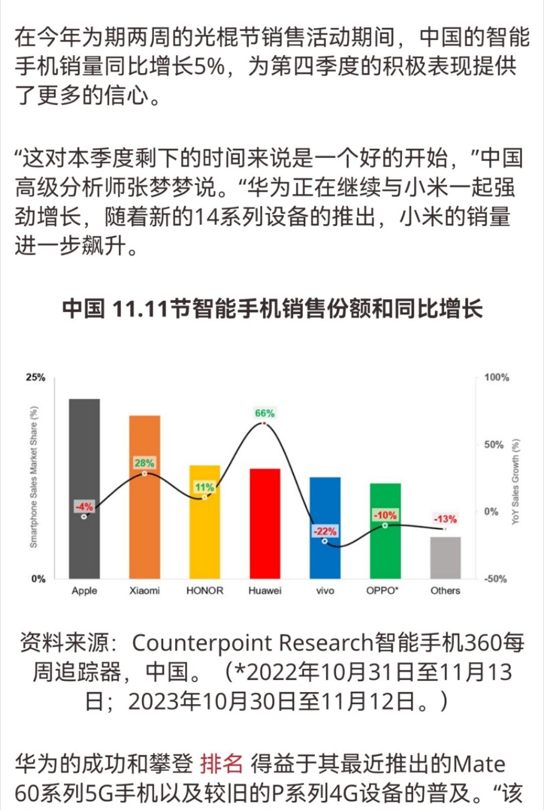 Counterpoint Research 公布《2023年双十一活动两周期间,国内智能手机销量统计调研报告》