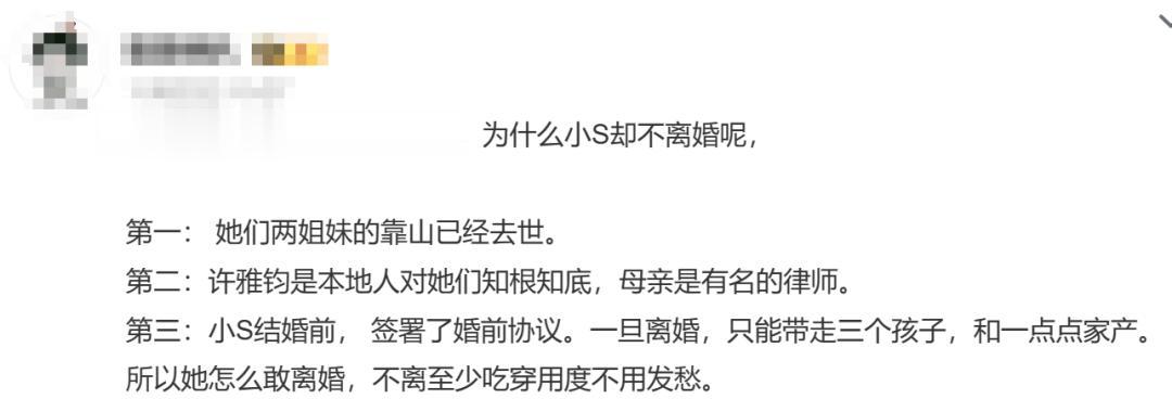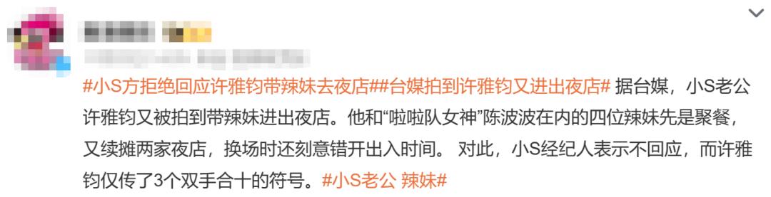小S老公深夜带辣妹聚餐,一晚换三个场,小S的爱到底多卑微? 台湾女明星小S的老公许雅钧经常被拍到带辣妹出入夜店,被调侃为“夜店小王子”。 对此,小S虽然有时会回应,但面对自己老公的夜店行为,她似乎并不在意。 许雅钧对夜店的热爱远超家庭,小S经常在节目中分享自己和老公的恩爱日常,但也承认自己很依赖老公。 许雅钧曾经被曝家暴,但小S否认并强调他们很相爱不会离婚。 她与许雅钧结婚18年,有三个女儿,但外界猜测许雅钧想要一个儿子。 小S曾在节目中分享自己和老公的恩爱日常,但也承认自己很依赖老公。