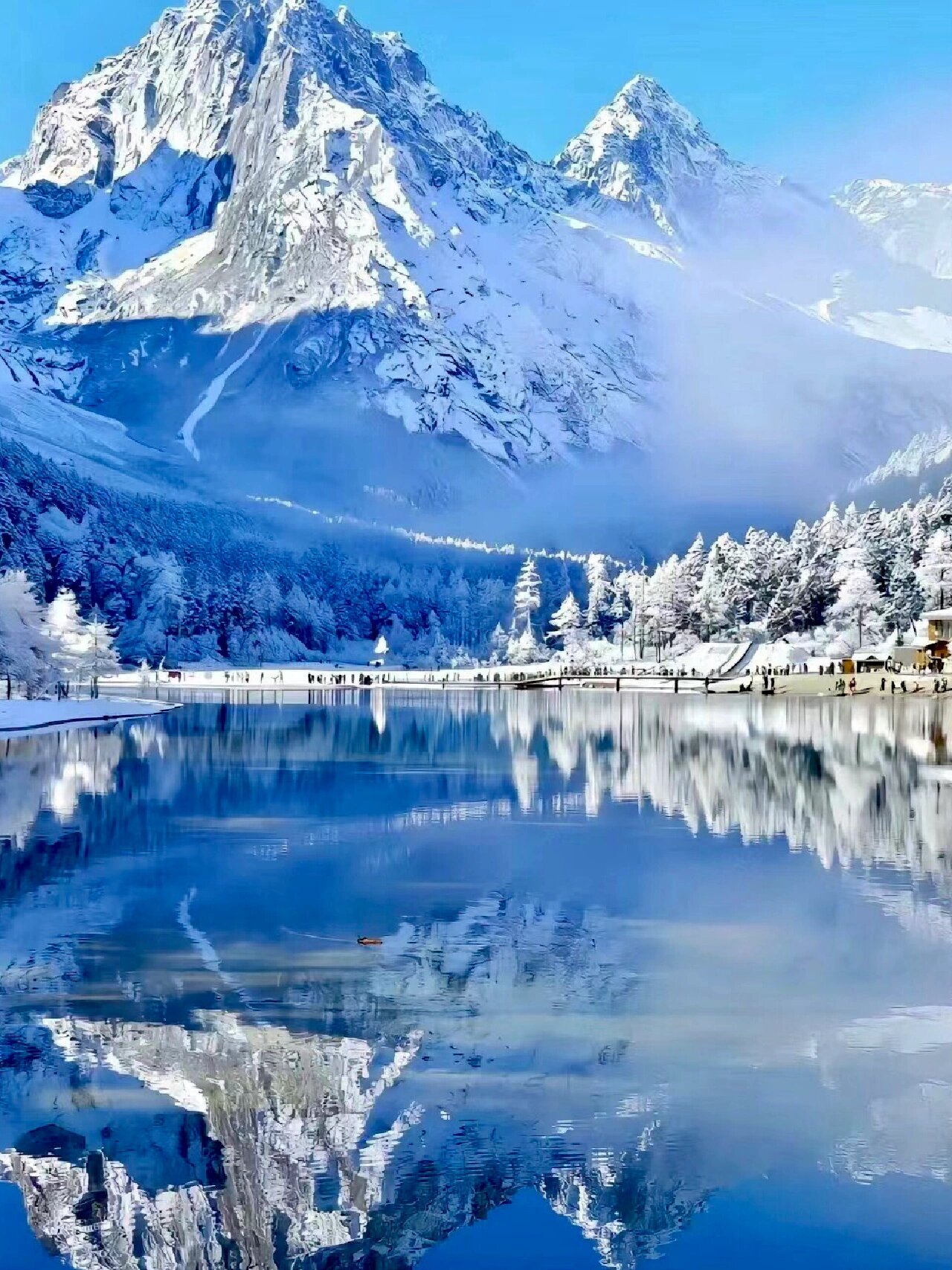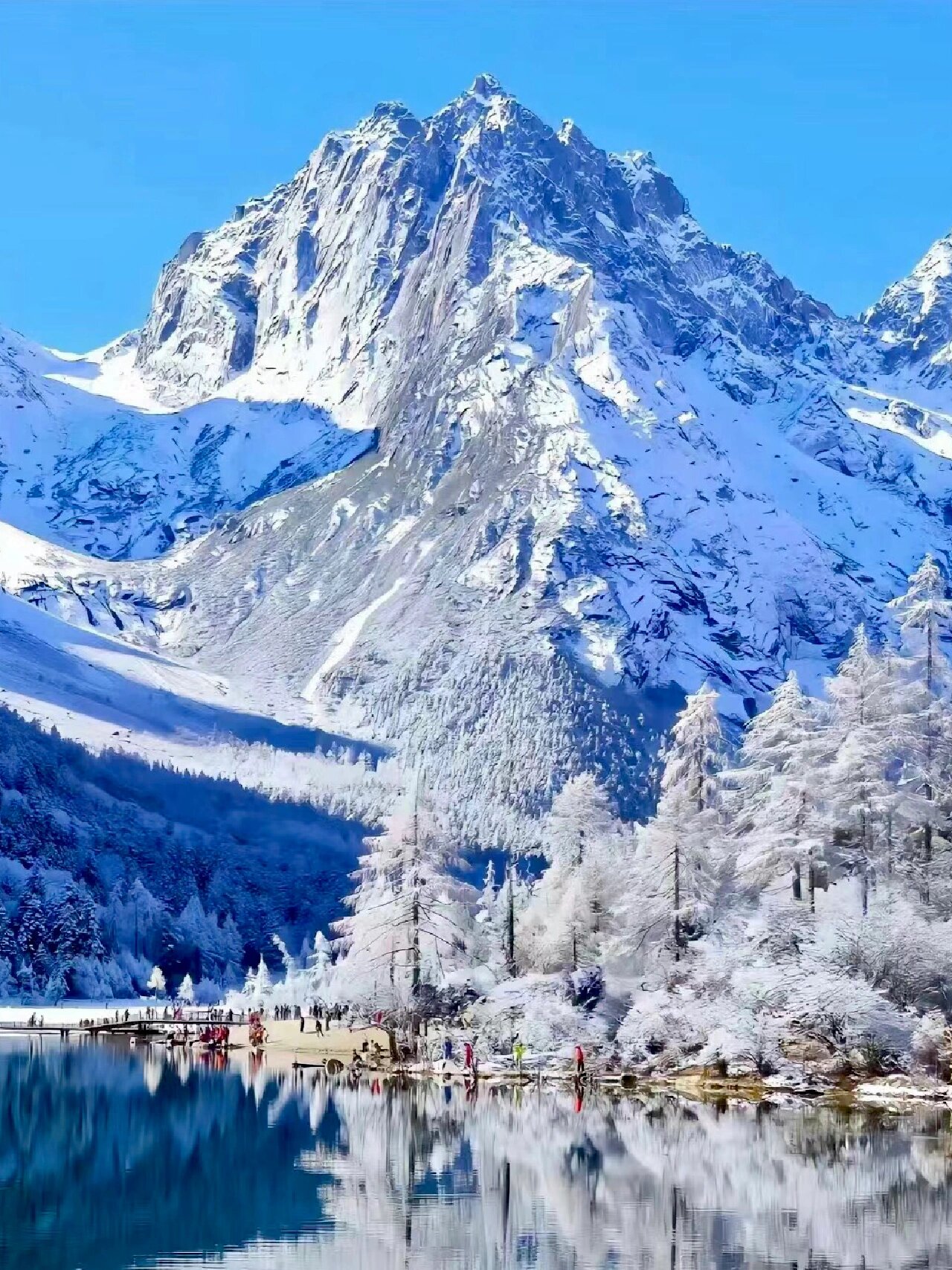 入冬的四姑娘山,在进入景区乘坐观光车以后,可以再车上看到网上疯传的雪山公路,雪山与树木上都是白皑皑的挂满了雪霜,观光车直达红杉林,从上开始游玩,一路往下游玩,路上的雪景也是绝美,沿途经过隆珠措、四姑娜措、布达拉峰、金刚山。在隆珠措可以清晰的看到枯树矗立在水中,与周围的雪景相融合,宛如画中世界一样