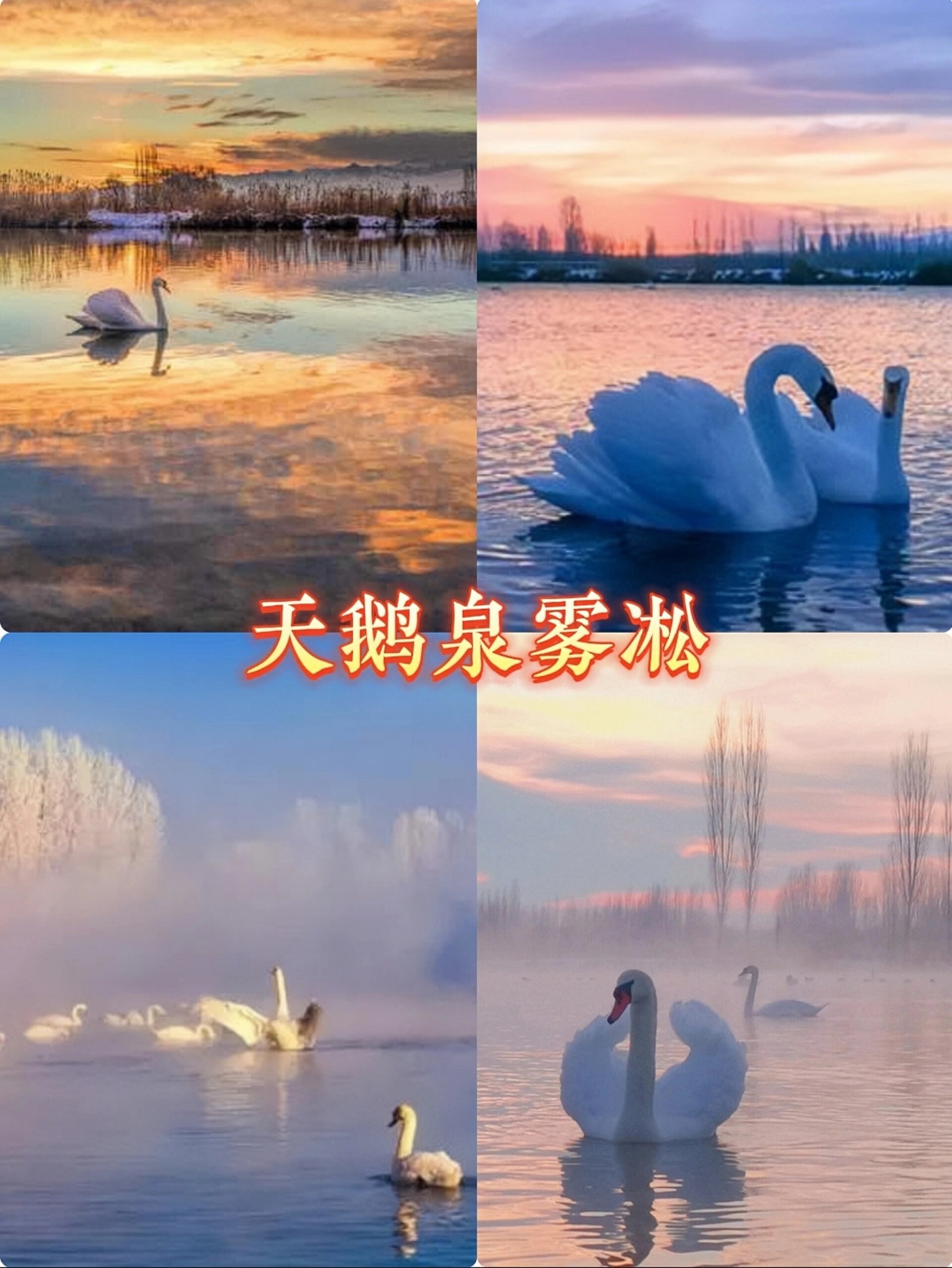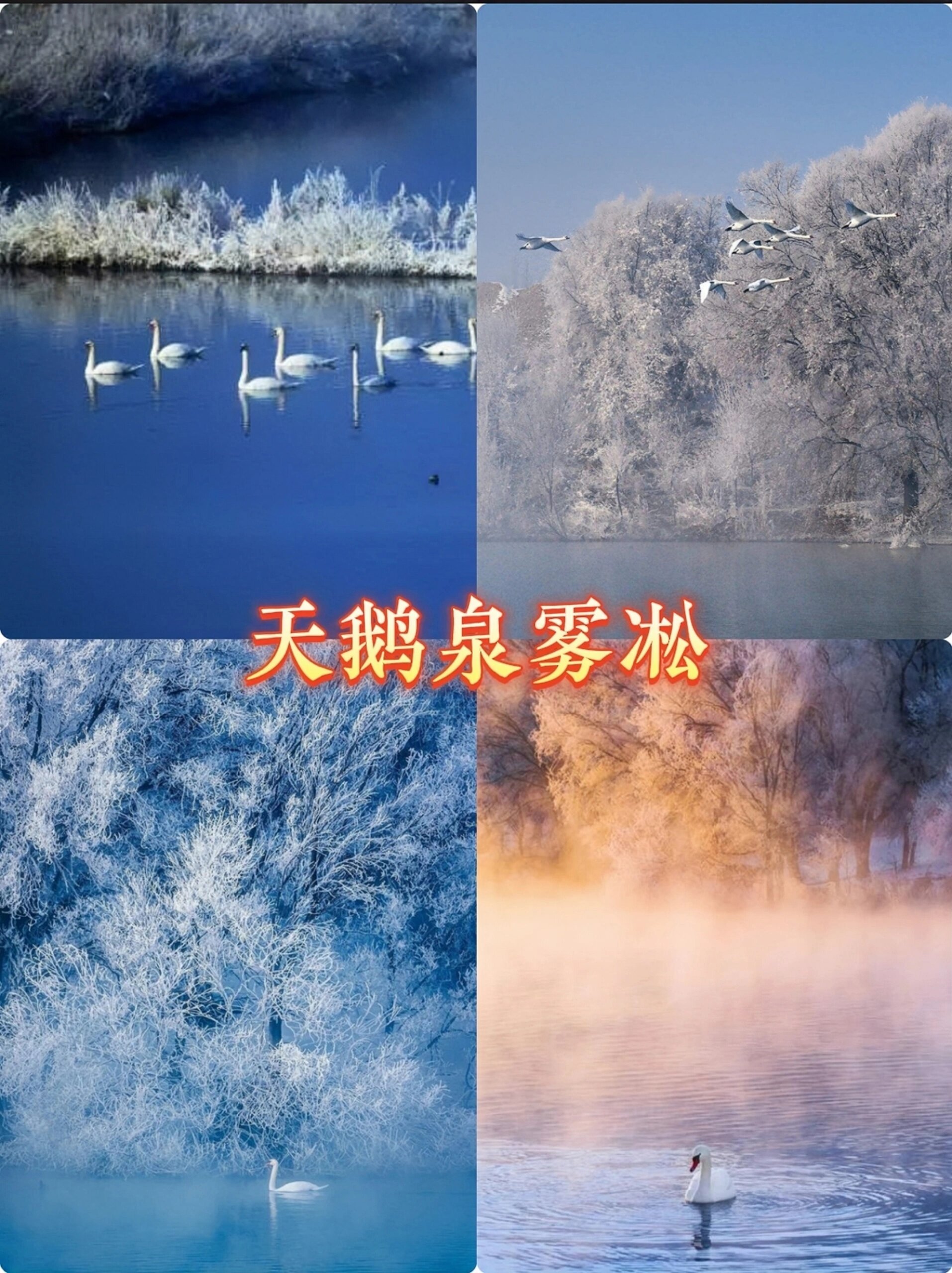 国内唯一能同时欣赏到优雅的白天鹅与洁白静谧的雾凇相映成趣的地方,天鹅泉边皑皑雪山绵延起伏,银装素裹的雾凇晶莹剔透,不论是晨雾、波光粼粼的下午,还是夕阳西下的傍晚,伴着一只只天鹅轻盈的舞姿,一切都美得如诗如画
