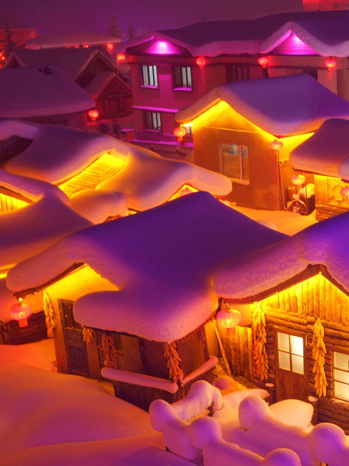 厚实的白雪覆盖在特色的木屋上,配上暖黄色灯光,宛如童话故事里的小镇...