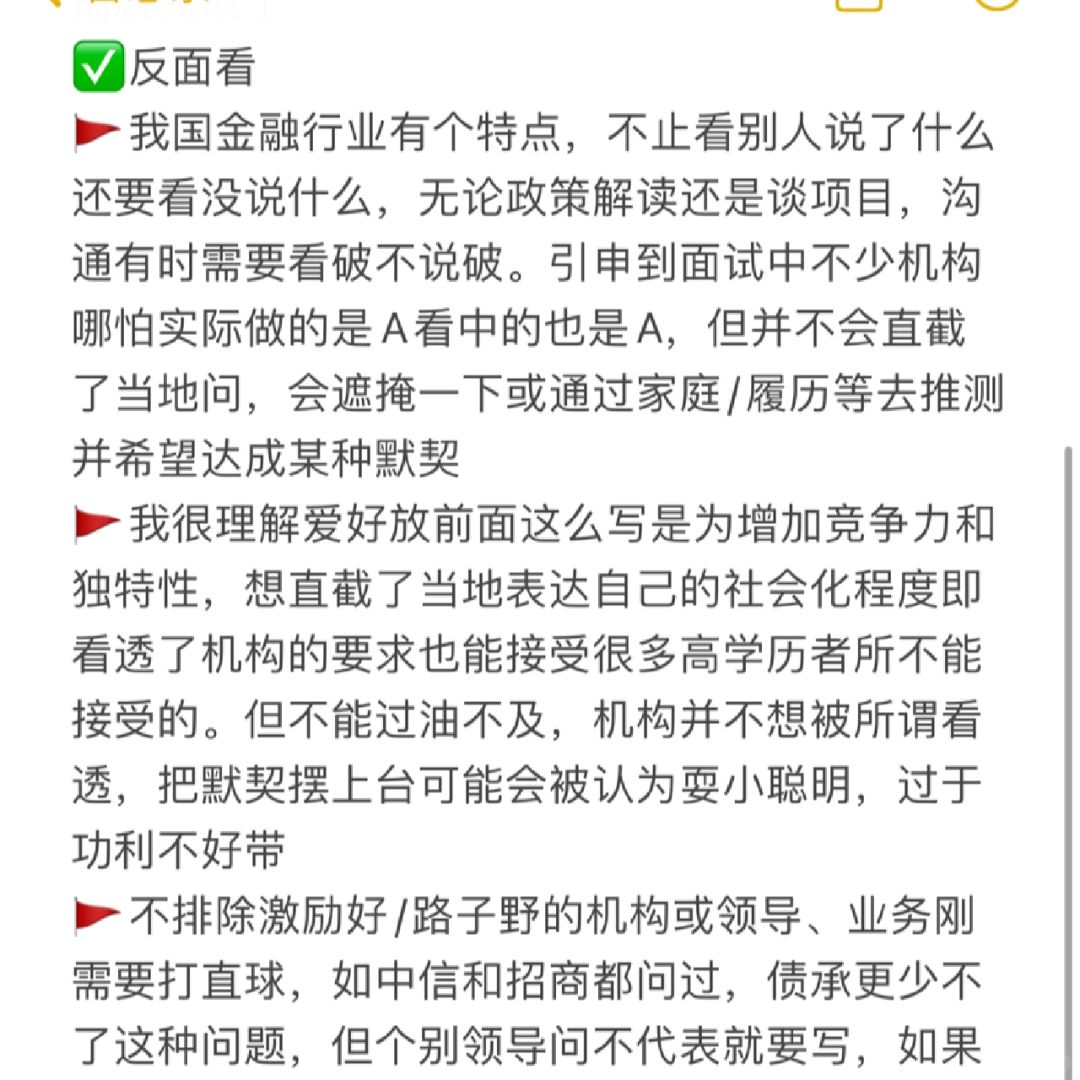 🚩我国金融行业有个特点,不止看别人说了什么还要看没说什么,无论政策解读还是谈项目,沟通有时需要看破不说破。引申到面试中不少机构哪怕实际做的是A看中的也是A,但并不会直截了当地问,会遮掩一下或通过家庭/履历等去推测并希望达成某种默契