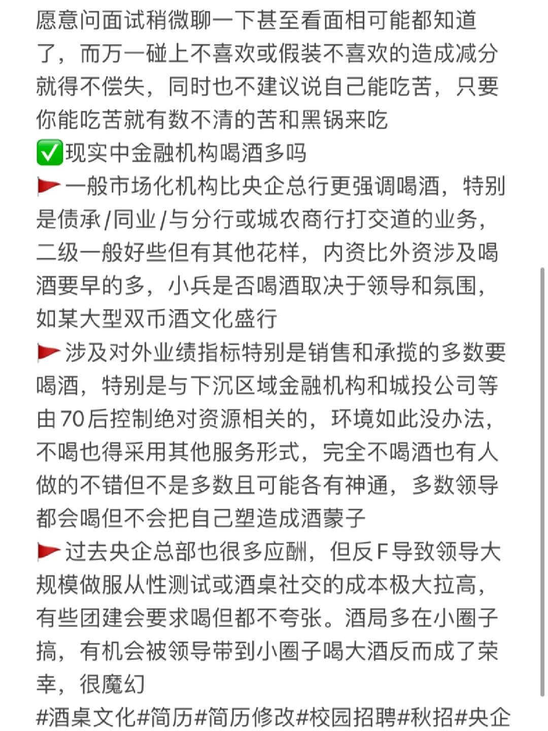 🚩涉及对外业绩指标特别是销售和承揽的多数要喝酒,特别是与下沉区域金融机构和城投公司等由70后控制绝对资源相关的,环境如此没办法,不喝也得采用其他服务形式,完全不喝酒也有人做的不错但不是多数且可能各有神通,多数领导都会喝但不会把自己塑造成酒蒙子