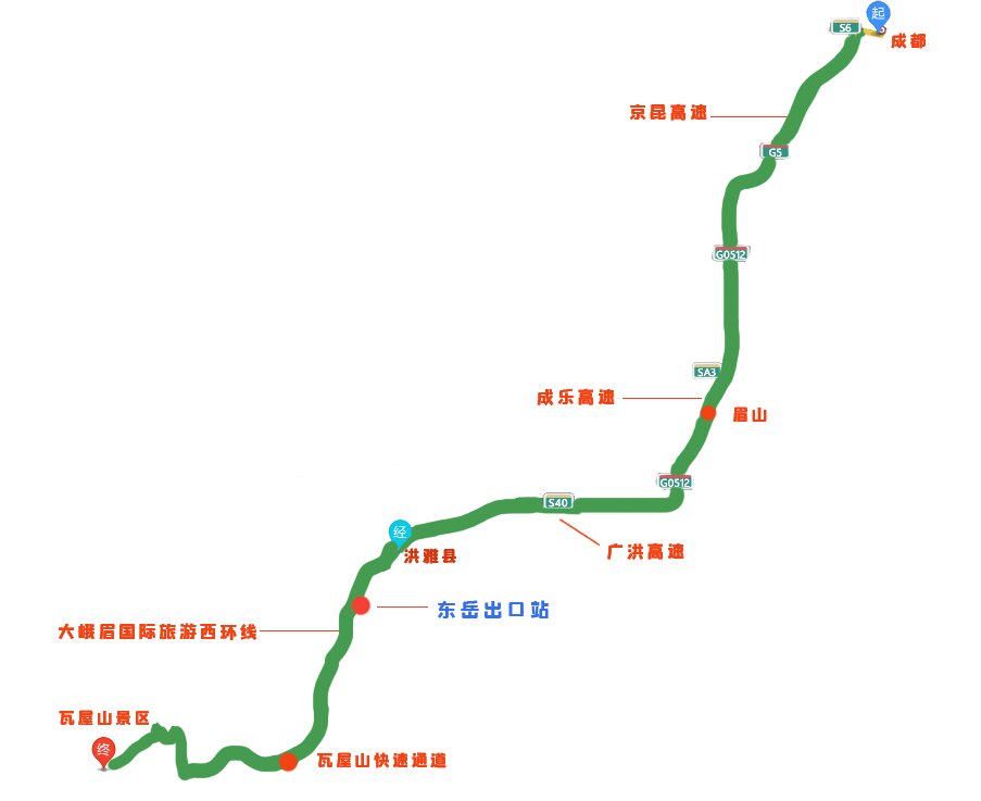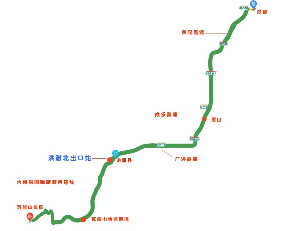 成都—京昆高速—成乐高速—广洪高速—成渝环线高速东岳出口-大峨眉国际旅游西环线-瓦屋山快速通道西环线-瓦屋山快速通道-洪瓦线-瓦屋山景区(全程月2小时)