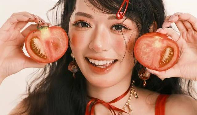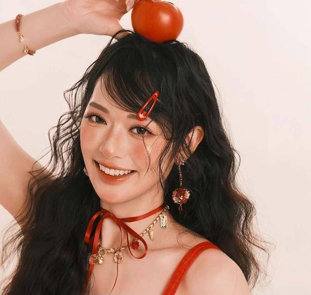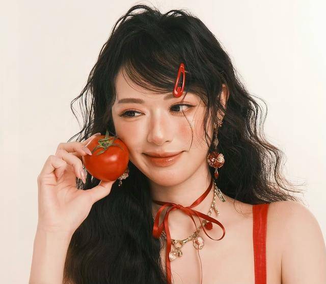这次冯盈盈分享了一组“番茄写真”,长卷发、红色发夹、红色裙子,都显得她相当俏皮、可爱。