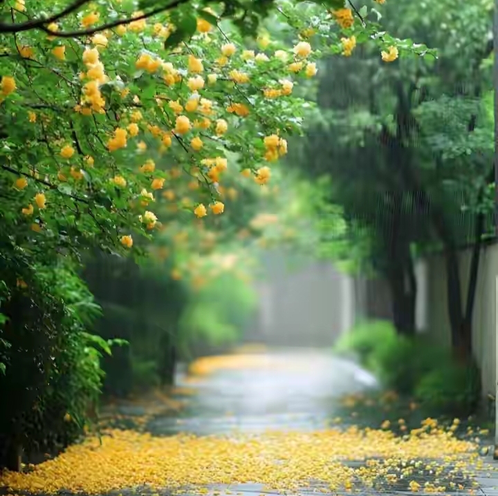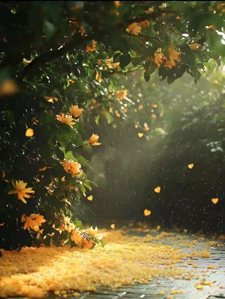 深秋,走在旧巷深处,脚步轻得像是怕惊扰了谁。墨绿的枝桠间满是金黄细碎的花蕊,一阵风掠过,细小的花朵在秋风的抚摸下翩翩飘舞,宛如一场从天而降的雨,在草地与石板路上铺上一层薄薄的“金雪”。每一片落下的花瓣,都像是一封没有署名的信,寄托着秋天的思绪和回忆。每一滴花雨,都代表着季节的流转与时光的沉淀。