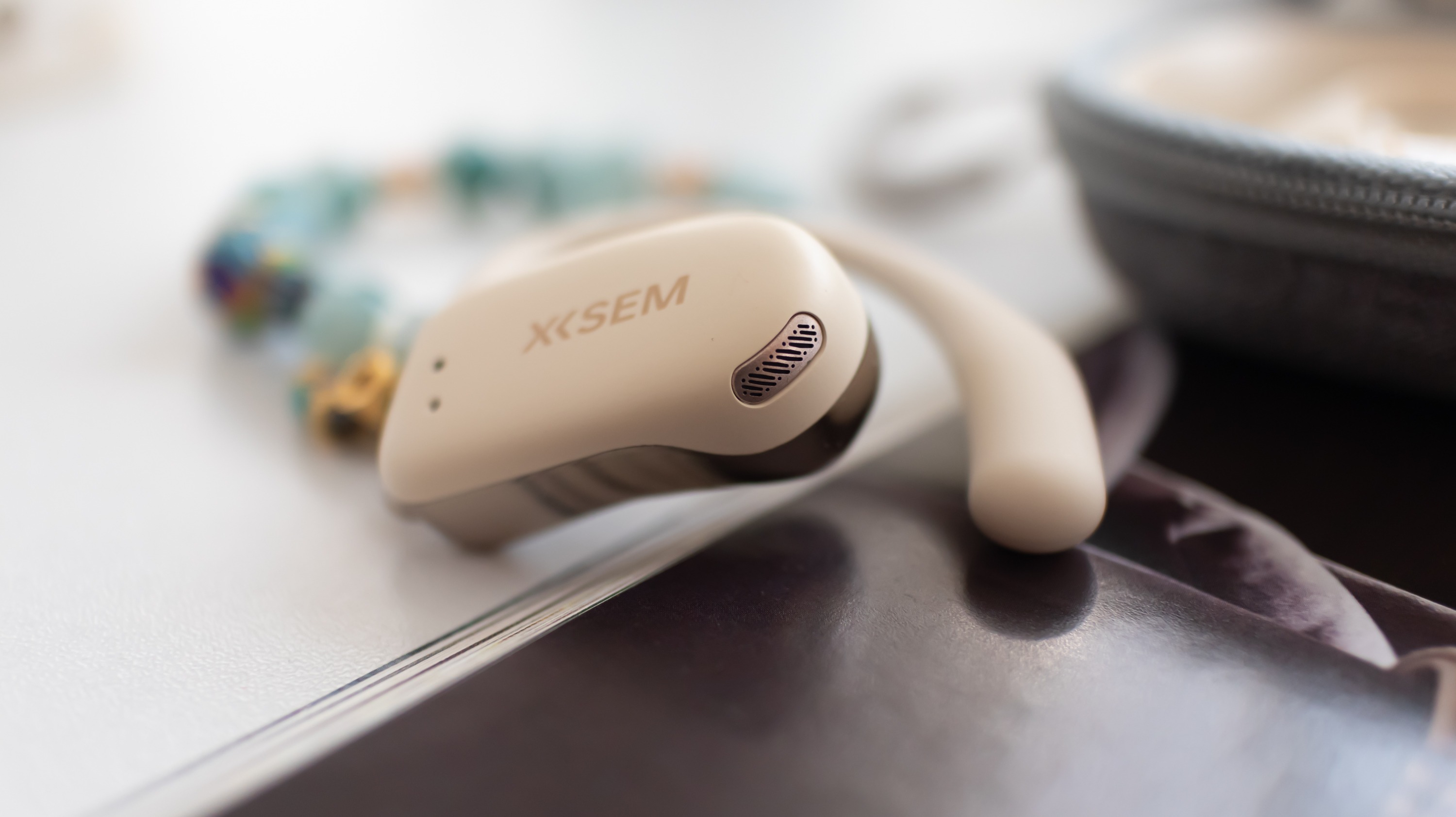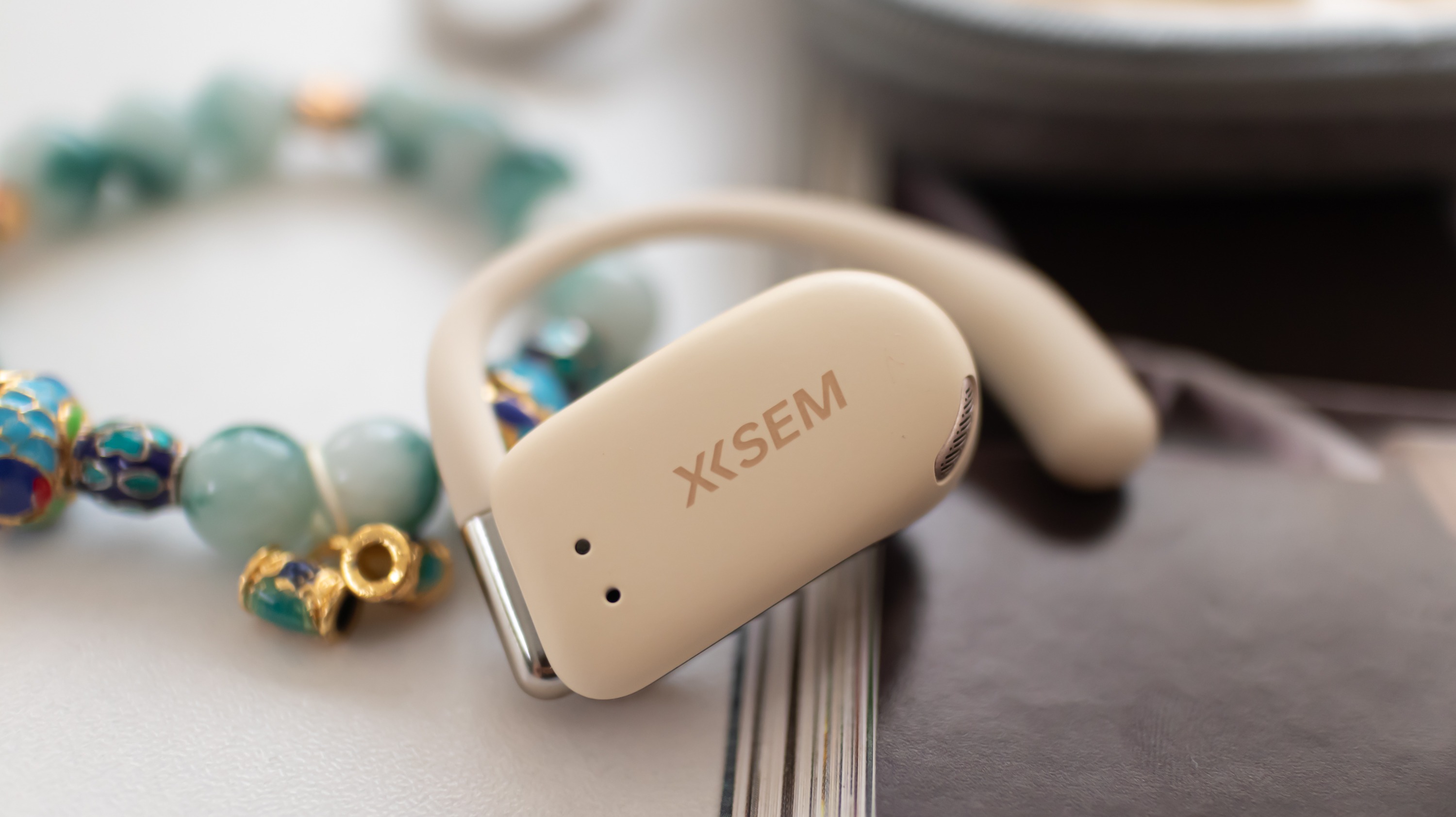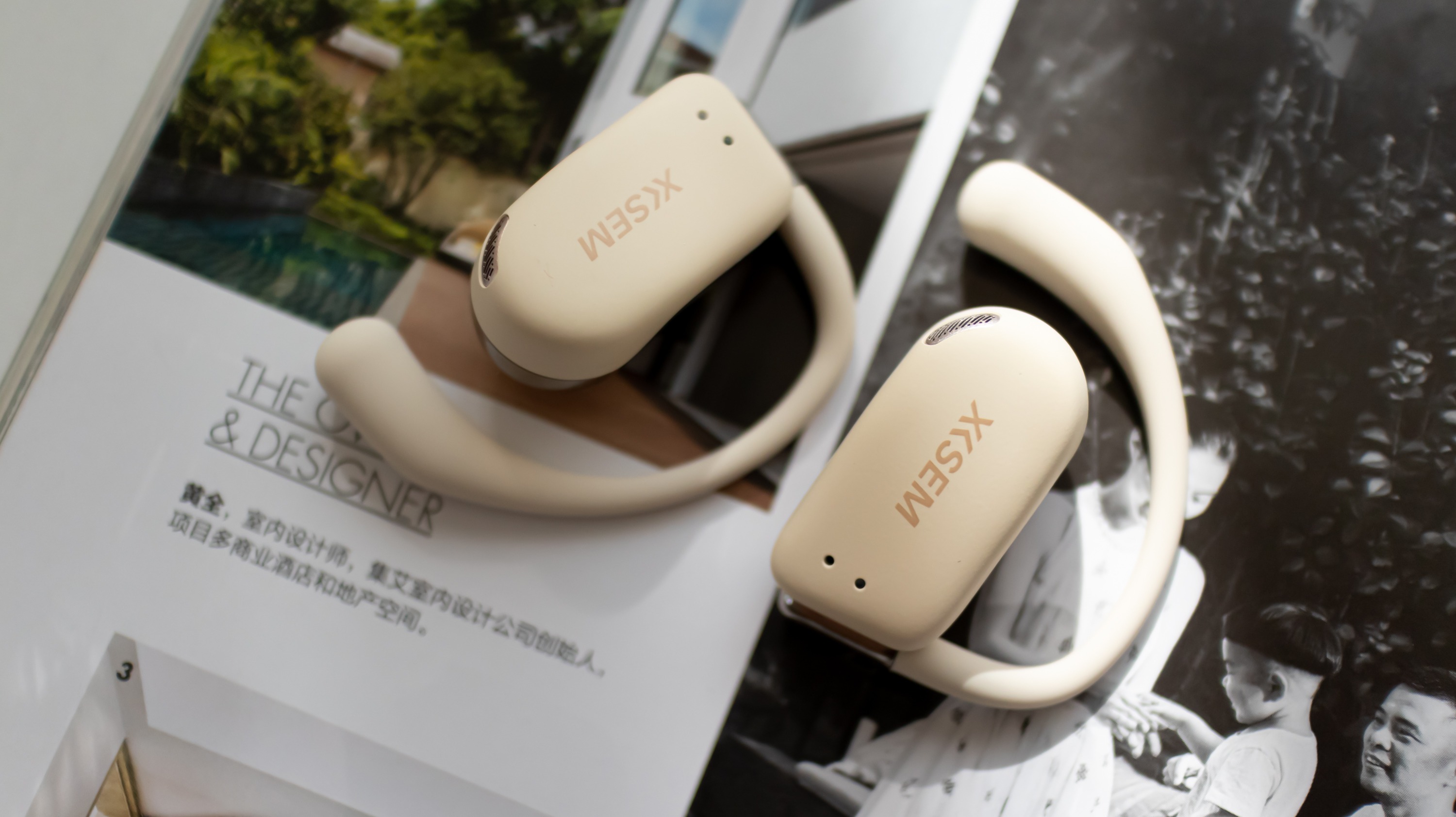 西圣Olite配色米白色,结构属于挂耳式耳机,腔体内结合了电池和主板等硬件,所以体积显得稍大,后面的耳挂则像眼镜腿一样。耳机表面是一层母婴级硅胶材质,手感亲肤细腻温润,内侧则是金属亮面质感,个人觉得这种拼接的颜值还是挺高的。