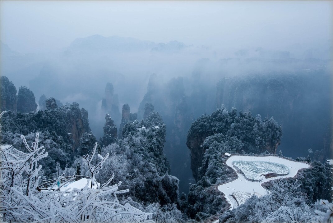 张家界的雪景灵动清秀。山峰、森林、溪流都被雪覆盖,宛如一幅水墨画。