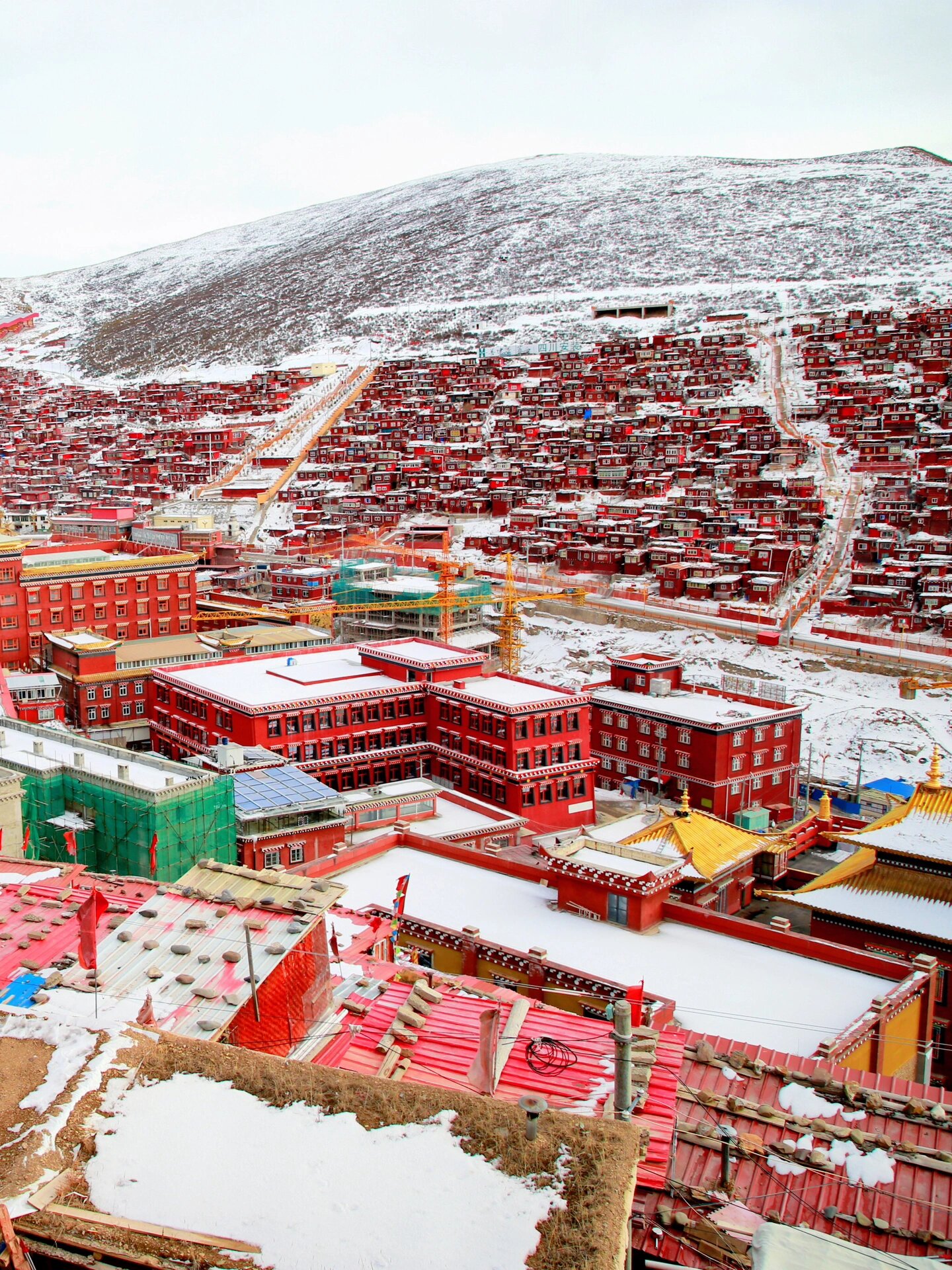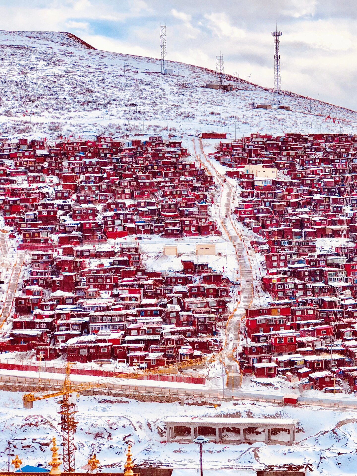 冬天一定要去色达,一整片的红房子被白雪覆盖