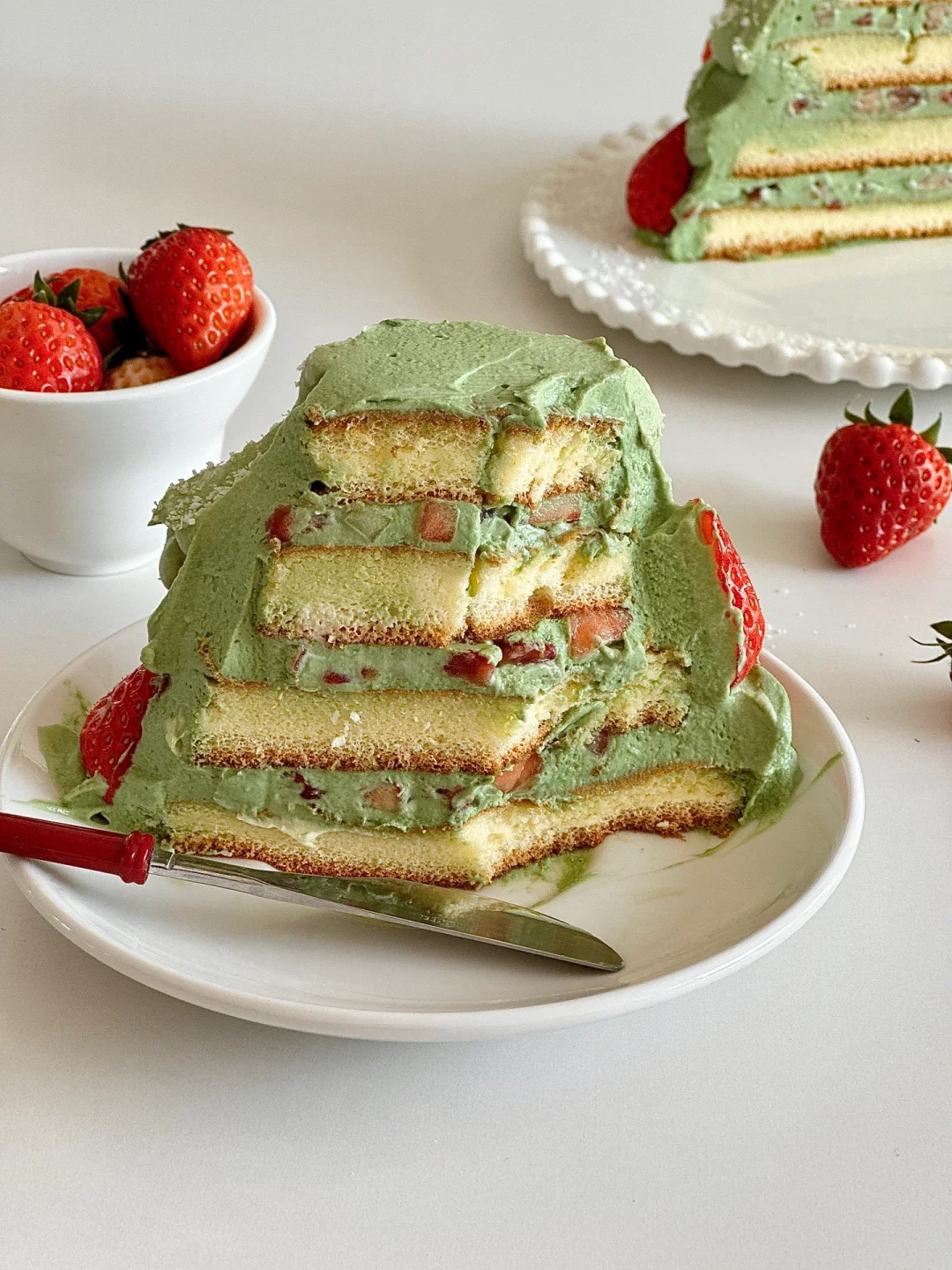 7.组装蛋糕:蛋糕片➕奶油➕草莓丁这样组装起来,再简单抹面,挤出花纹(参考做法图),用蛋糕装饰,撒上椰蓉即可~