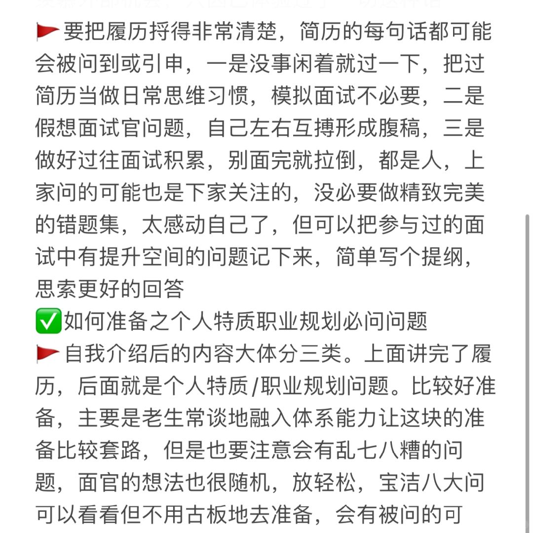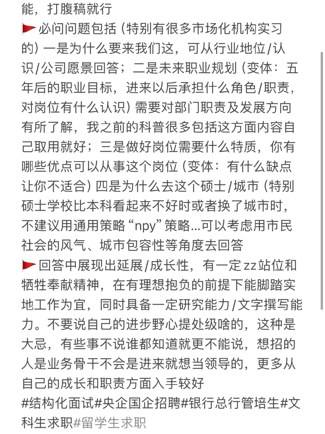 🚩必问问题包括(特别有很多市场化机构实习的)一是为什么要来我们这,可从行业地位/认识/公司愿景回答;二是未来职业规划(变体:五年后的职业目标,进来以后承担什么角色/职责,对岗位有什么认识)需要对部门职责及发展方向有所了解,我之前的科普很多包括这方面内容自己取用就好;三是做好岗位需要什么特质,你有哪些优点可以从事这个岗位(变体:有什么缺点让你不适合)四是为什么去这个硕士/城市(特别硕士学校比本科看起来不好时或者换了城市时,不建议用通用策略“npy”策略…可以考虑用市民社会的风气、城市包容性等角度去回答