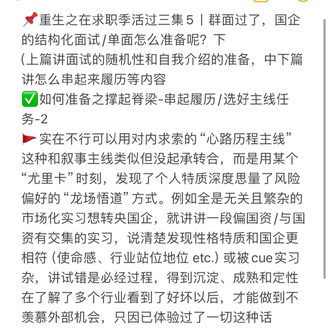 🚩实在不行可以用对内求索的“心路历程主线”这种和叙事主线类似但没起承转合,而是用某个“尤里卡”时刻,发现了个人特质深度思量了风险偏好的“龙场悟道”方式。例如全是无关且繁杂的市场化实习想转央国企,就讲讲一段偏国资/与国资有交集的实习,说清楚发现性格特质和国企更相符(使命感、行业站位地位 etc.)或被cue实习杂,讲试错是必经过程,得到沉淀、成熟和定性在了解了多个行业看到了好坏以后,才能做到不羡慕外部机会,只因已体验过了一切这种话