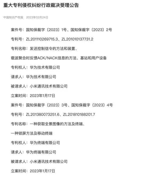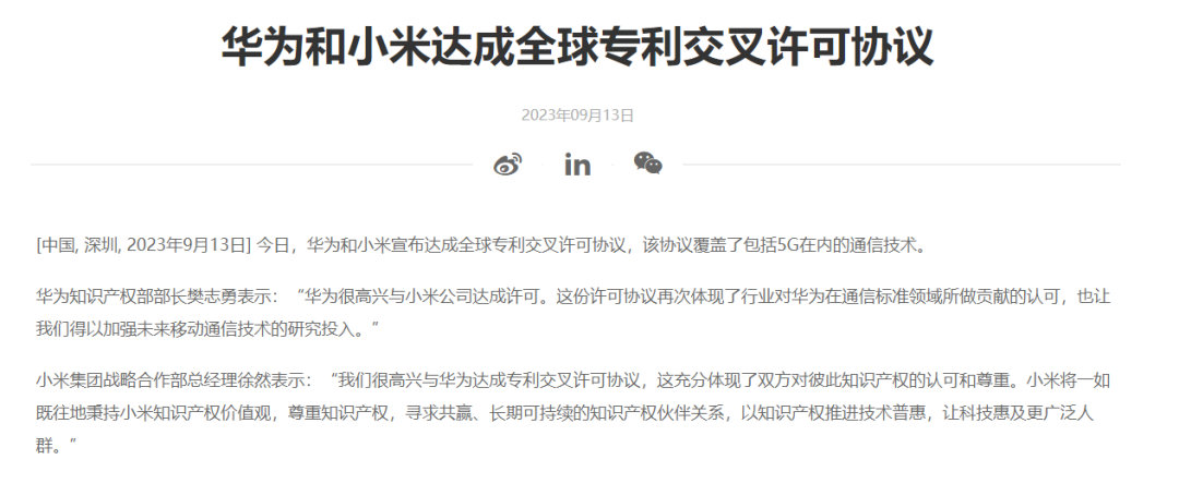前有华为告小米专利侵权,后以“华为和小米宣布达成全球专利交叉许可协议,该协议覆盖了包括5G在内的通信技术”而告终。