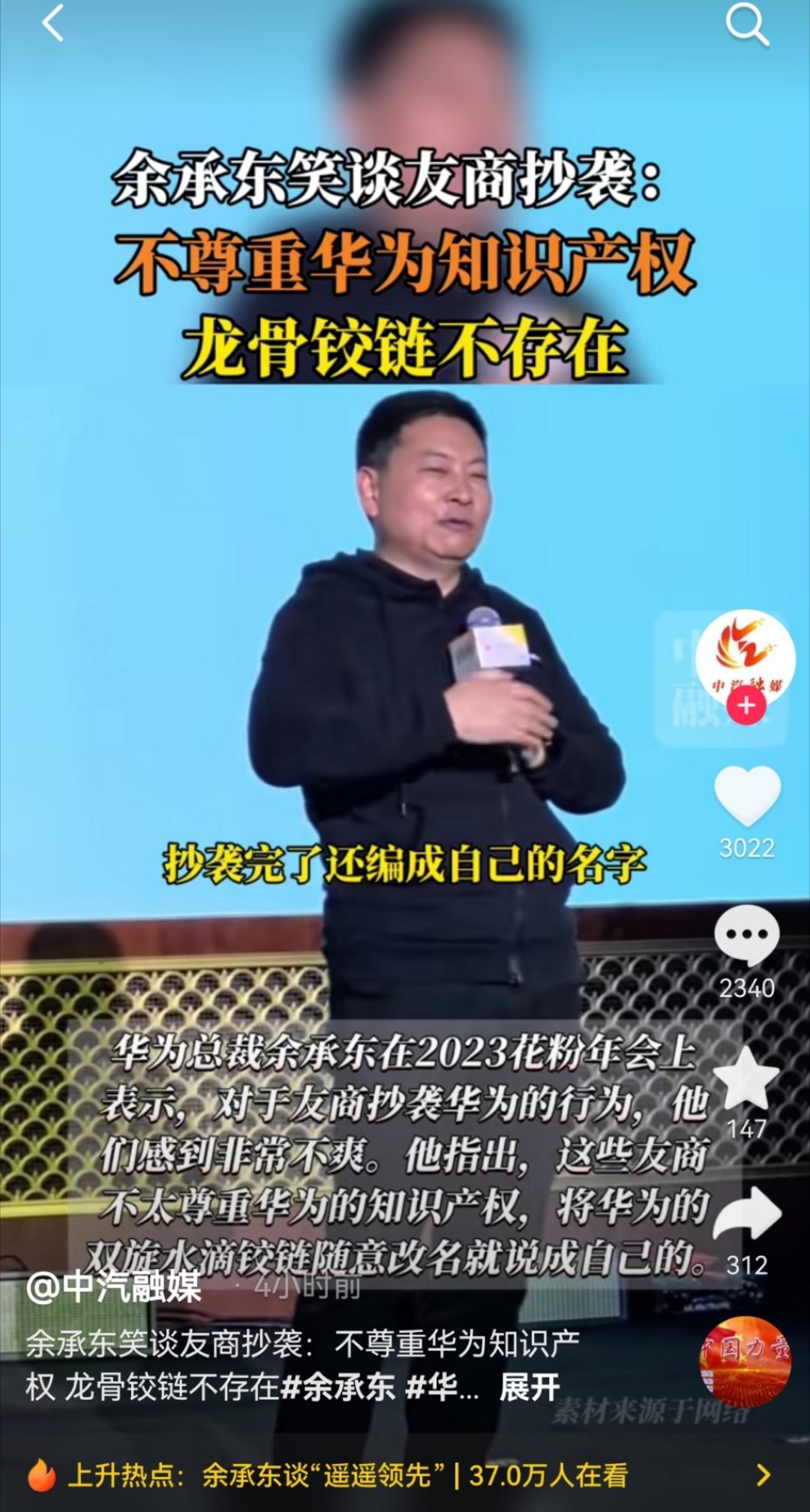 “小米:我们专利申请在前,公开在前,余承东说的三级杆还没量产,我们龙骨铰链是纯自研,和你说的同一个东西”